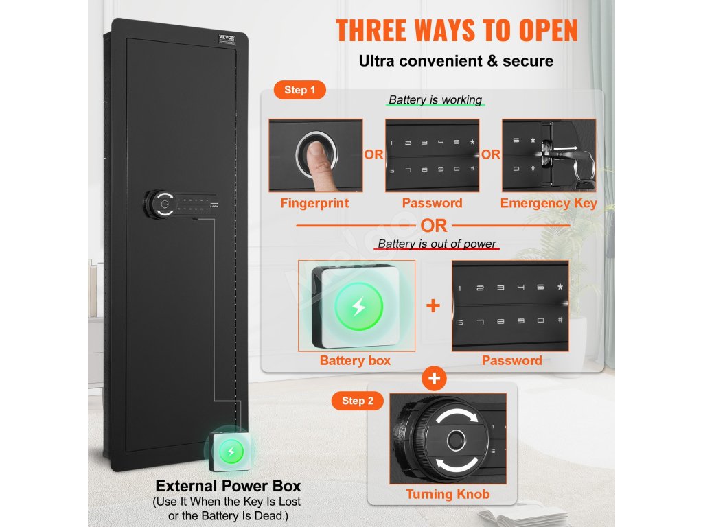 Nástenný trezor ponúka viacero spôsobov odomykania pre jednoduchosť, čo vám umožňuje ovládať zabezpečenie jediným tlačidlom. A obsahuje aj dočasnú núdzovú schránku na batérie, ktorá zabezpečí funkčnosť v prípade zabudnutých hesiel alebo vybitých batérií.