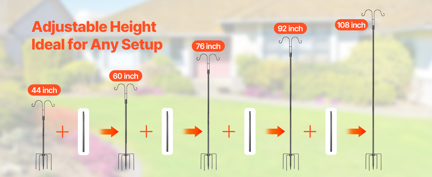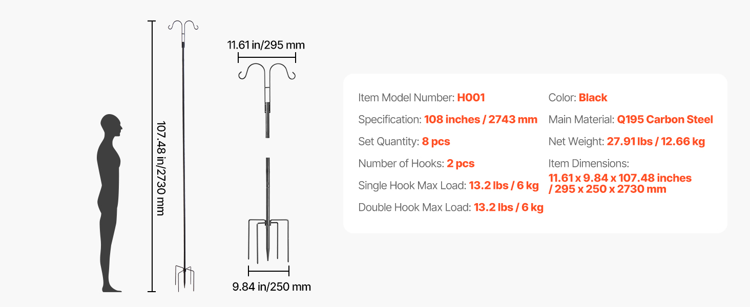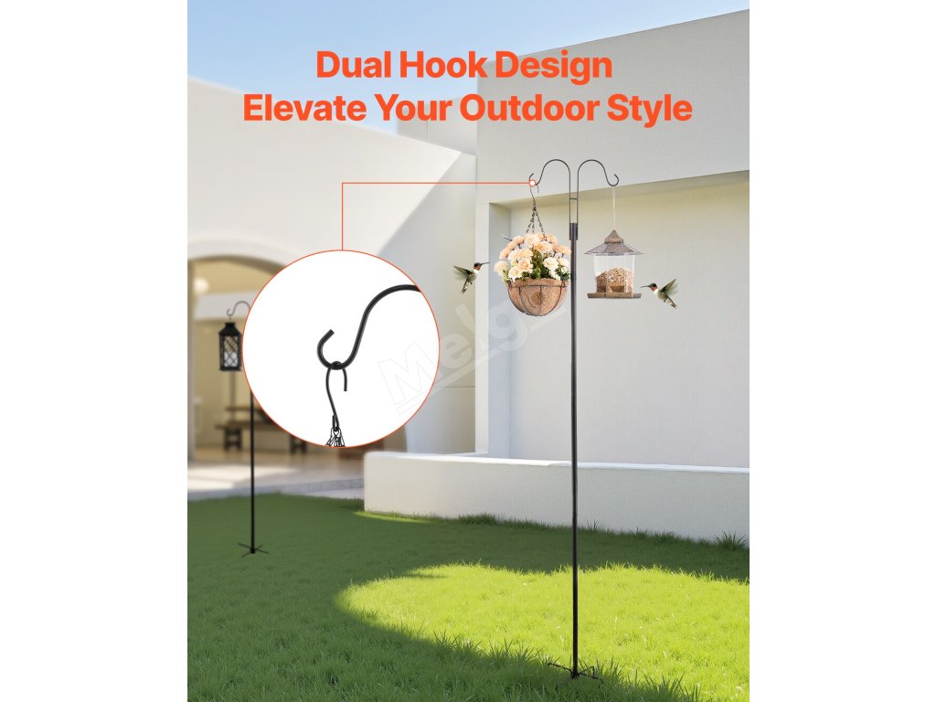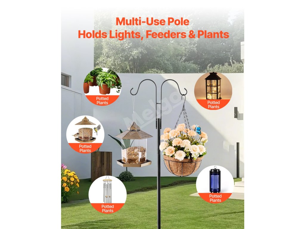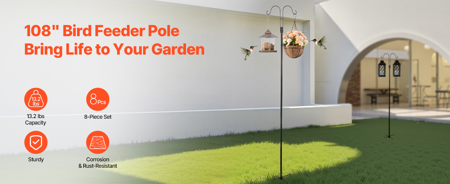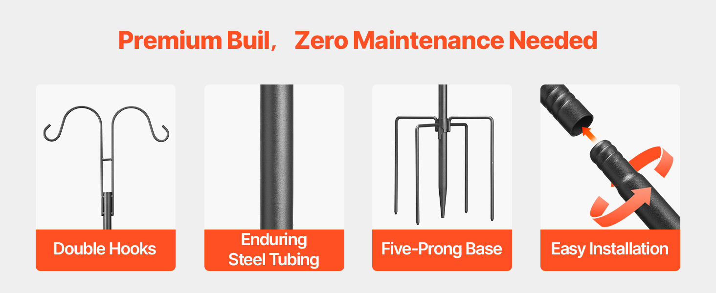 Táto tyč na kŕmidlo pre vtáky je vyrobená z hrubej ocele odolnej voči korózii a je odolná a pevná. Jej stabilná základňa zaručuje, že zostane vo vzpriamenej polohe aj vo veternom počasí, čo vám dodá pokoj. Všestranný dizajn, ktorý vyhovuje všetkým vašim potrebám vonkajšieho dekoratívneho zariadenia.