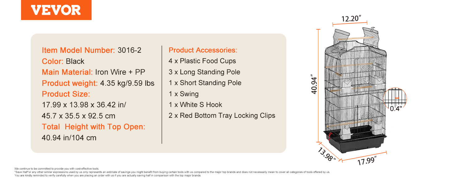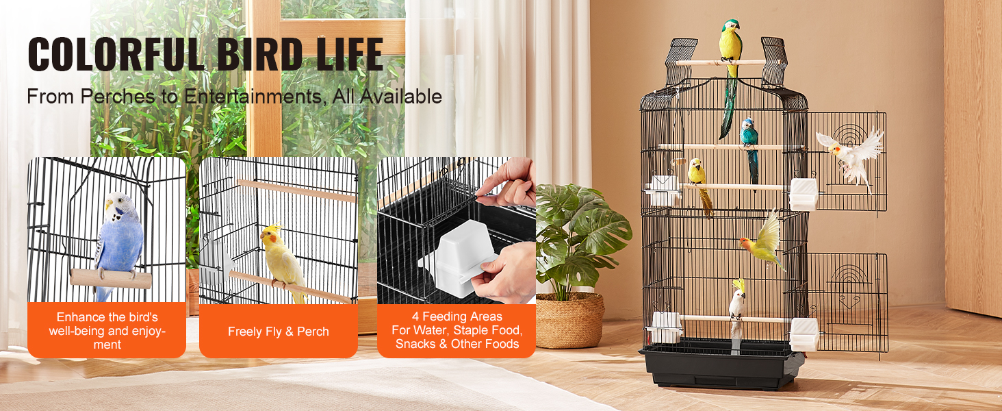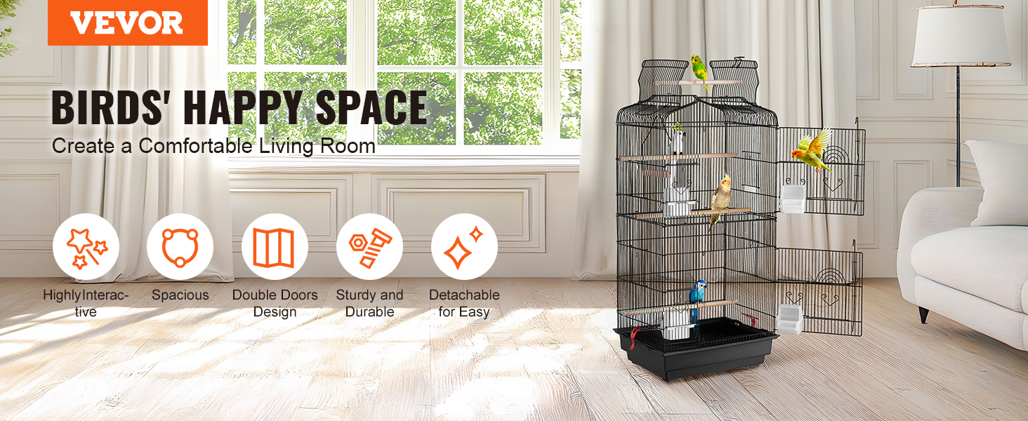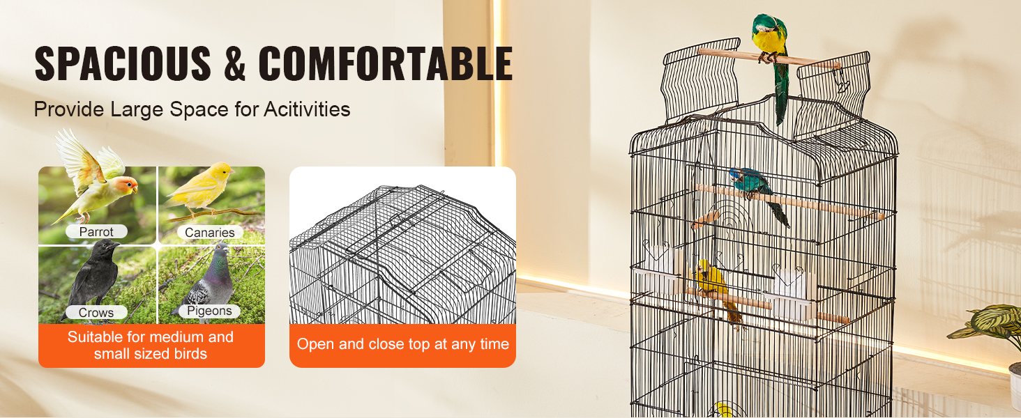 Táto klietka pre vtáky poskytuje priestranný a pohodlný životný priestor pre malé až stredne veľké vtáky. Vrchnú časť možno otvoriť, aby si vtáky mohli užívať voľný let, a dvojité dvierka uľahčujú interakciu. Zásuvkový podnos uľahčuje čistenie a pevný železný drôt zaisťuje dlhodobú odolnosť.