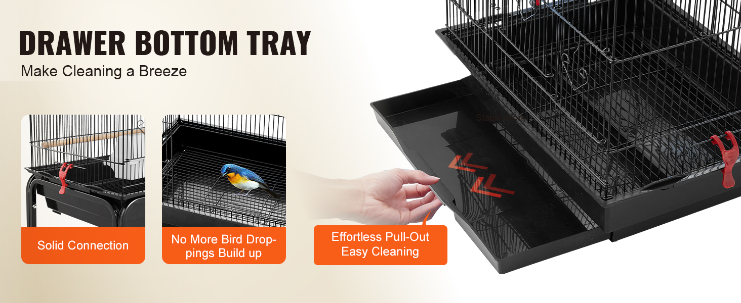 Čistenie vtáčej klietky nikdy nebolo jednoduchšie! Konštrukciu základne v tvare zásuvky možno na čistenie ľahko vytiahnuť, mriežka účinne zabraňuje hromadeniu vtáčieho trusu a udržiava klietku čistú. Poskytnite svojim vtákom čisté a pohodlné životné prostredie.