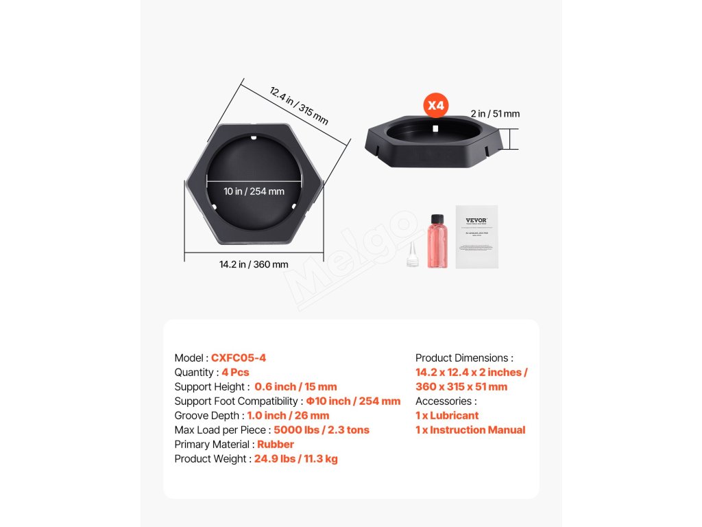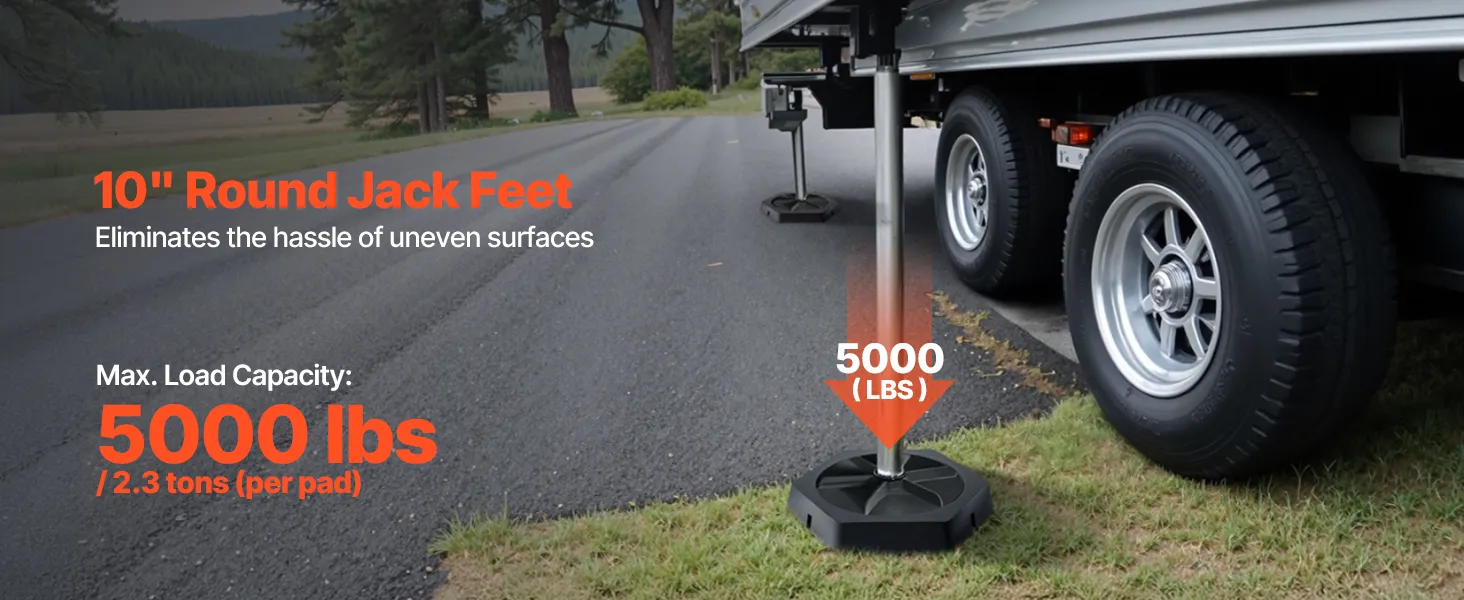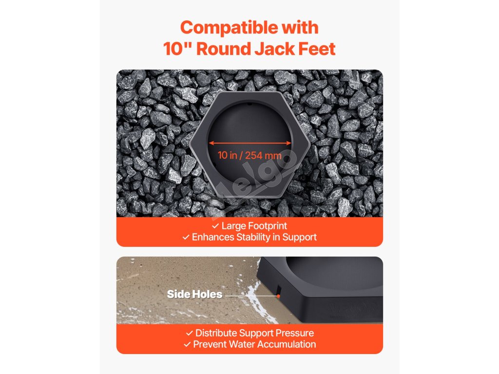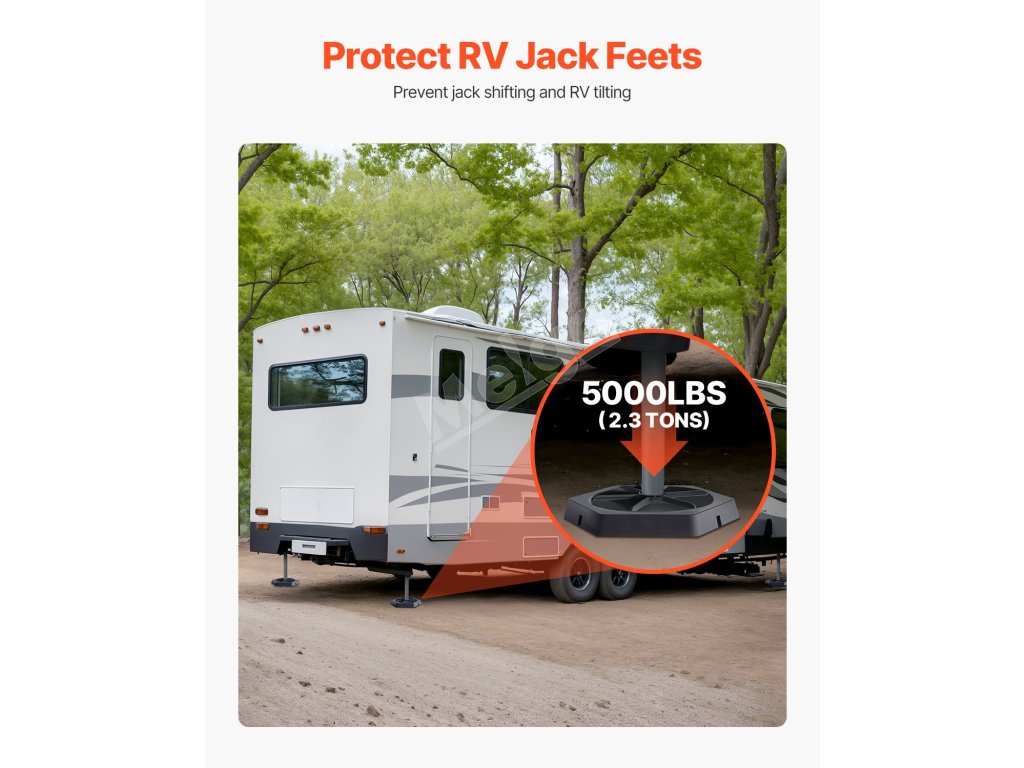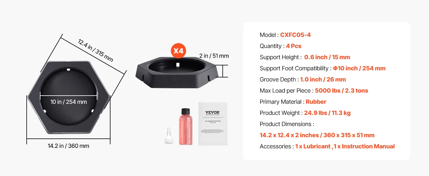 Naše okrúhle vyrovnávacie podložky pre obytné vozidlá sú vyrobené z vysokokvalitnej gumy s odolným, neroztrhnuteľným a protišmykovým dizajnom. Tieto podložky pod zdviháky RV (4 ks) s nosnosťou 5000 libier na podložku zlepšujú stabilitu na nerovnom povrchu. Súčasťou balenia je aj mazivo na jednoduchú inštaláciu.