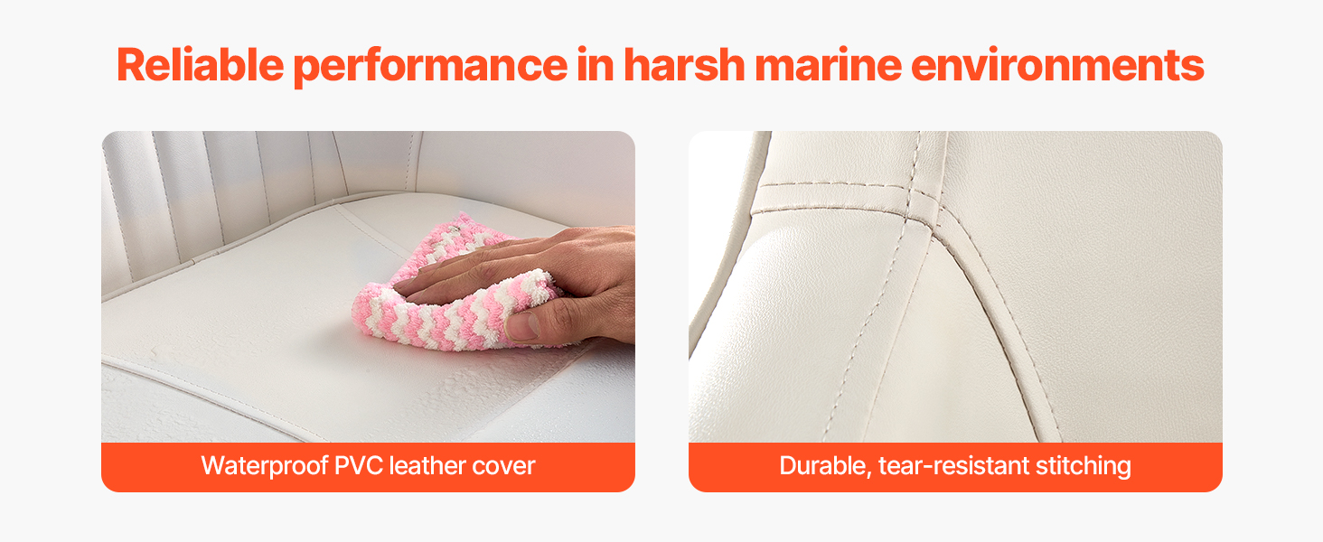 Toto sedadlo do člna je obalené odolnou, pevne prešitou kožou z PVC a upevnené kovovými skrutkami odolnými proti korózii, je vodotesné, odolné proti korózii a skonštruované tak, aby odolalo živlom. Či už ide o slanú vodu, slnko alebo dážď, toto sedadlo si zachováva svoju výkonnosť a zabezpečuje dlhotrvajúcu jazdu na vode.