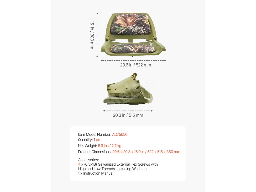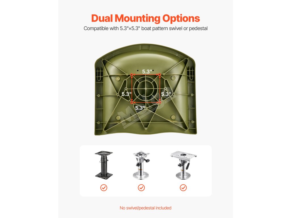 Spodné montážne otvory majú rozmery 5,3 x 5,3 palca, čo umožňuje umiestniť sedadlo do rybárskeho člna priamo na plošinu alebo ho namontovať na väčšinu podstavcov. Upozornenie: otočné podstavce a podperné základne nie sú súčasťou balenia.