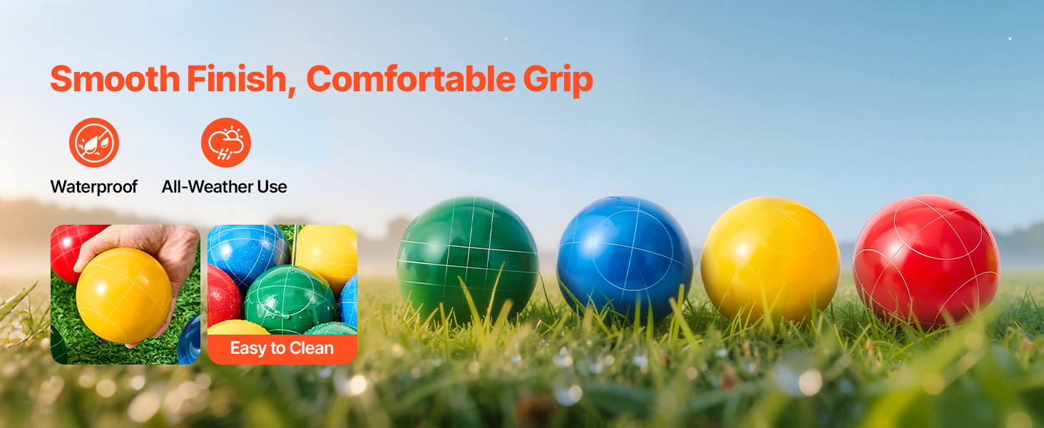 Hladké živicové loptičky na bocciu poskytujú vynikajúcu priľnavosť a skvele sa držia v ruke. Vďaka konštrukcii odolnej voči vode je čistenie jednoduché a hra vám vydrží za každého počasia.