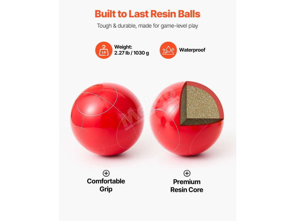 Táto súprava loptičiek na plážové boccia, ktorá je vyrobená z jadra z vysokohustotnej živice a odolného vonkajšieho plášťa, ako aj z vodoodpudivého puzdra, je skonštruovaná na dlhodobé používanie a spoľahlivý výkon vo vonkajšom prostredí.