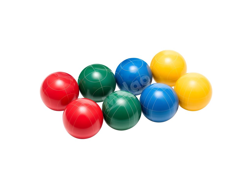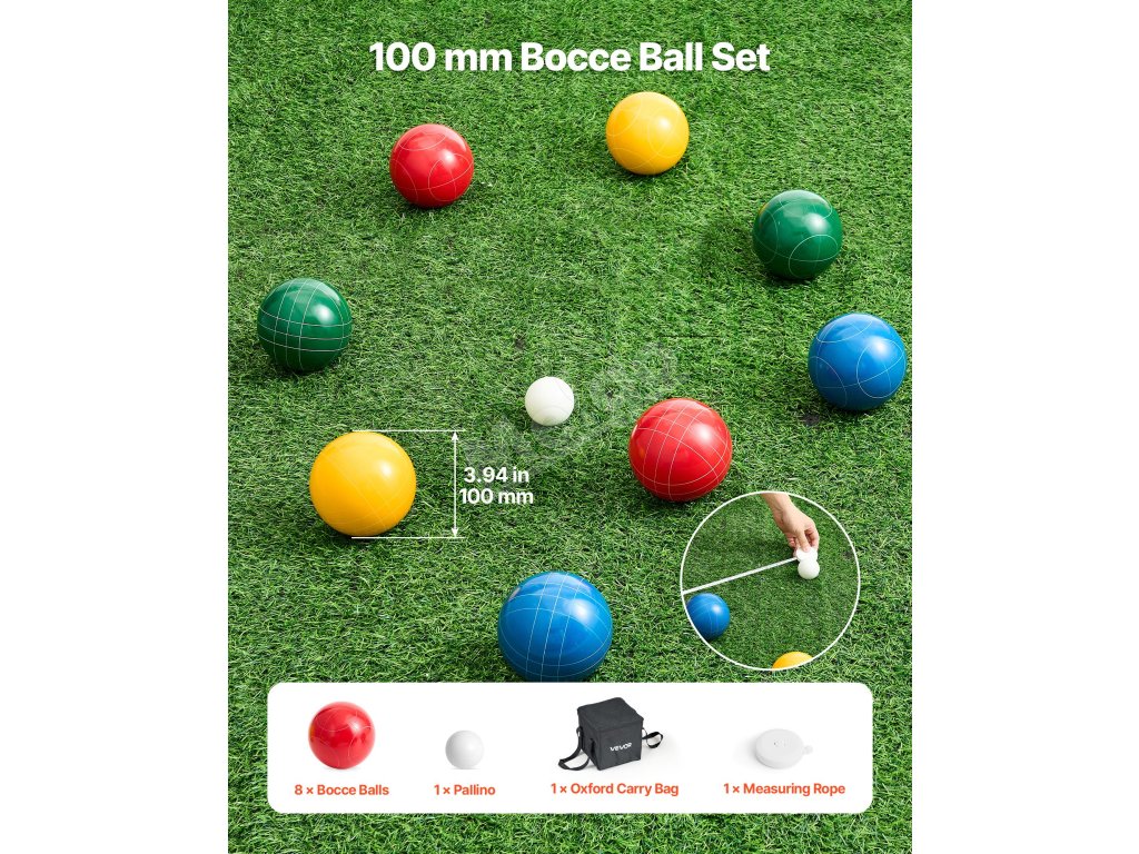 Sada bocce 8 gúľ 100 mm, pallino, vak, šnúra, 2–8 hráčov, 4 farby