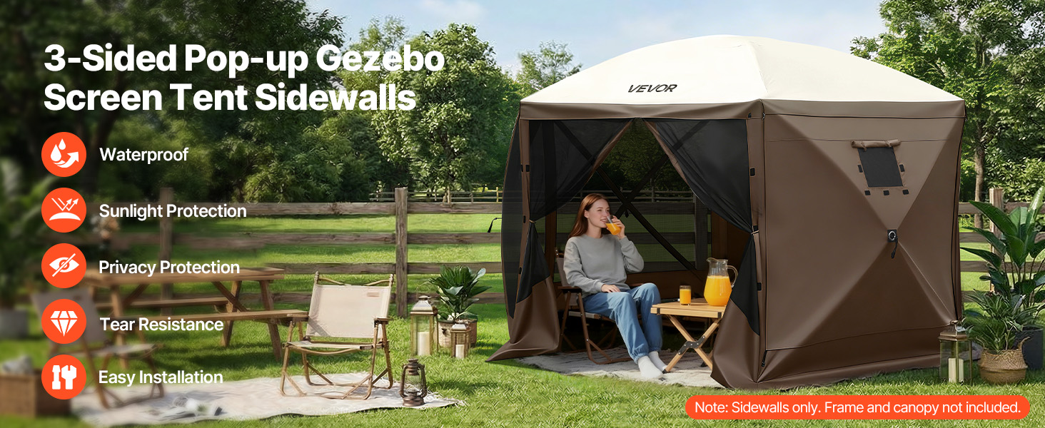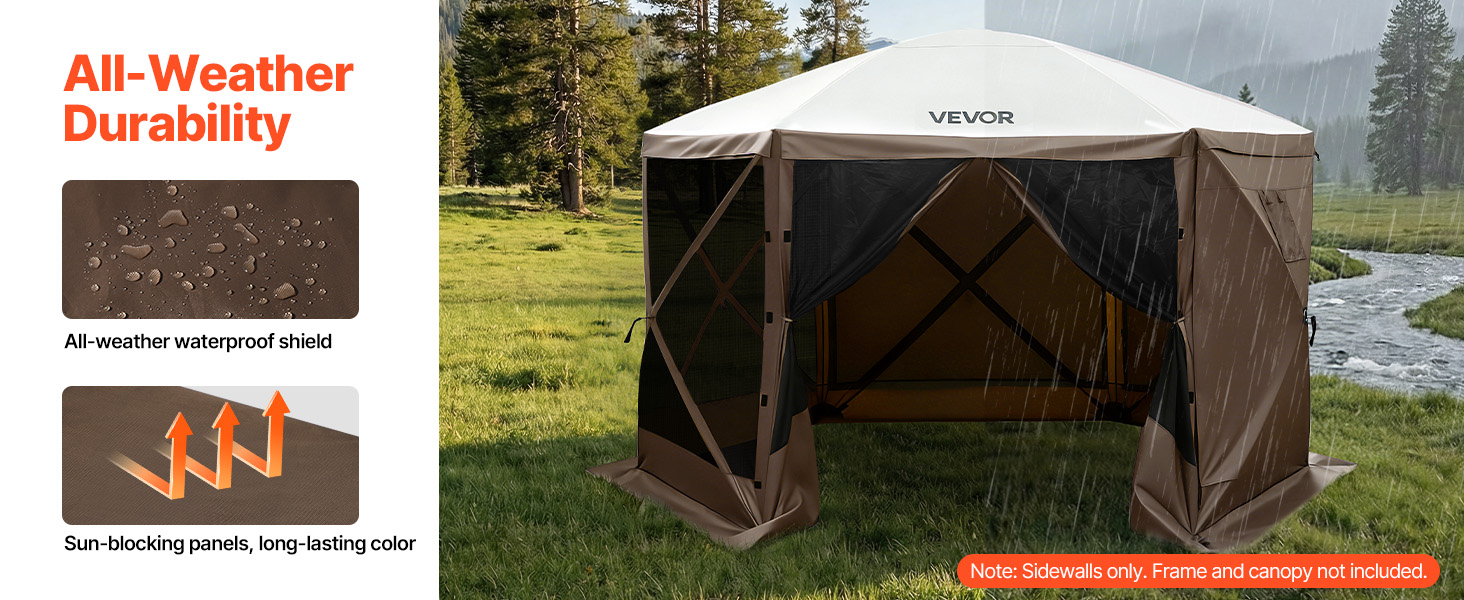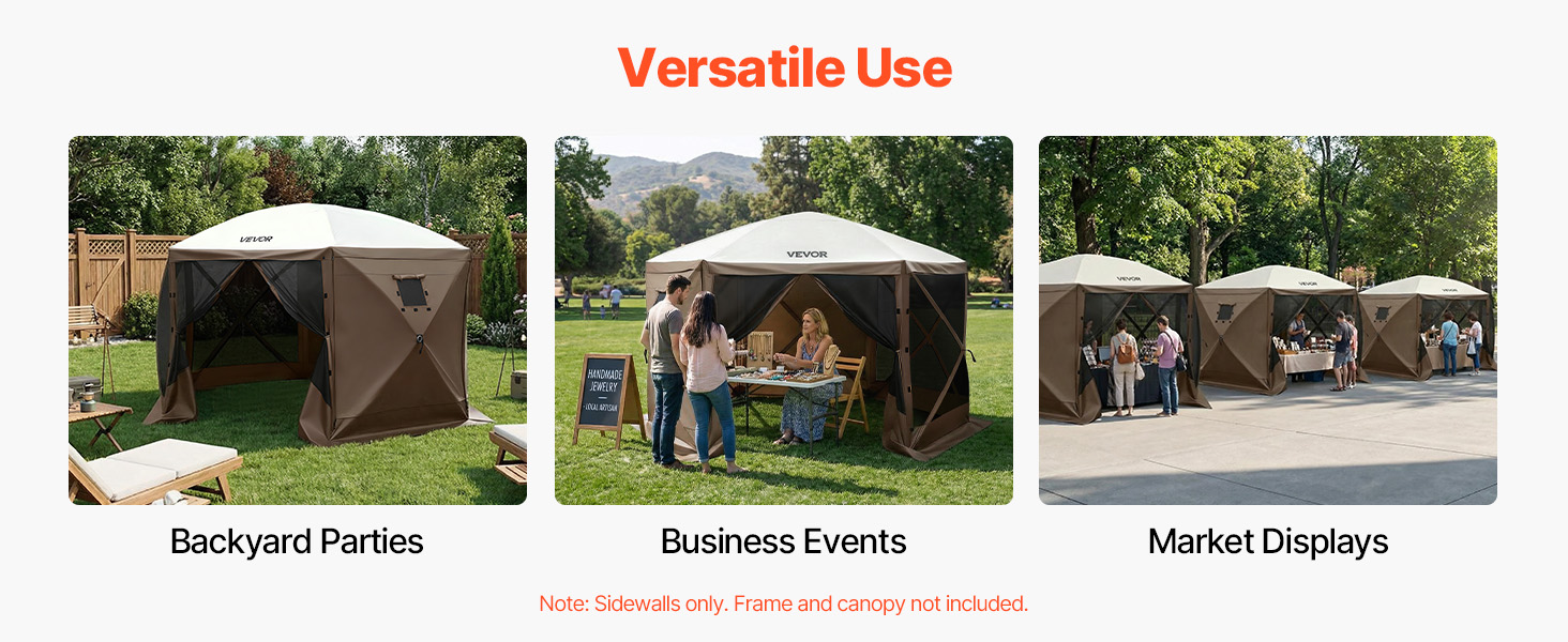 Naše bočné steny sú vhodné na pikniky, kempovanie, trhy, veľtrhy a iné komerčné účely, kde poskytujú lepší tieň, súkromie a ochranu v akomkoľvek prostredí.