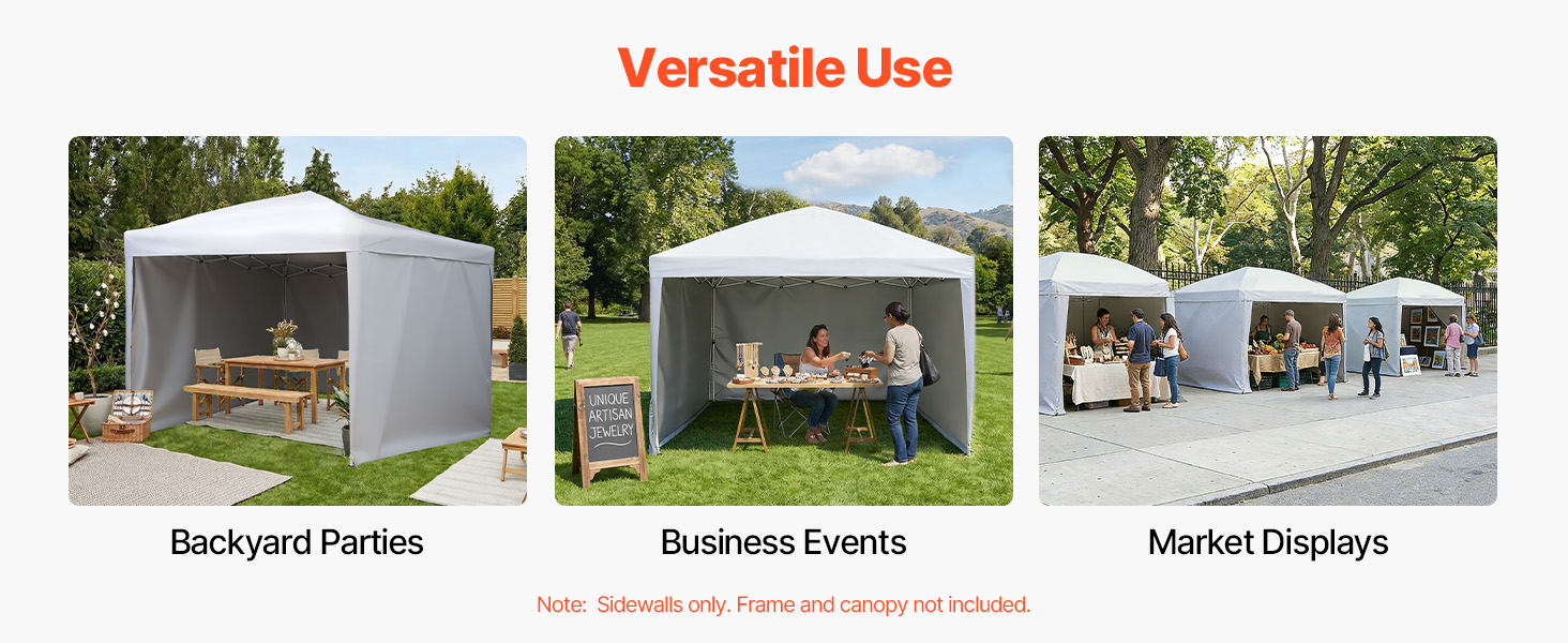Naše bočné steny sú vhodné na pikniky, kempovanie, trhy, veľtrhy a iné komerčné účely, kde poskytujú lepší tieň, súkromie a ochranu v akomkoľvek prostredí.
