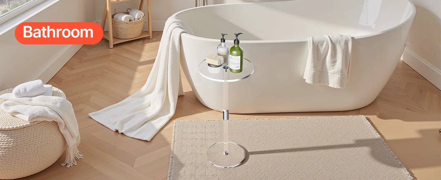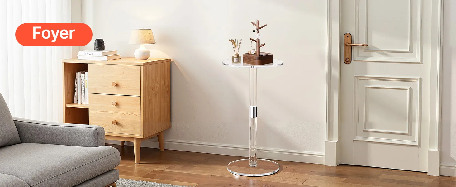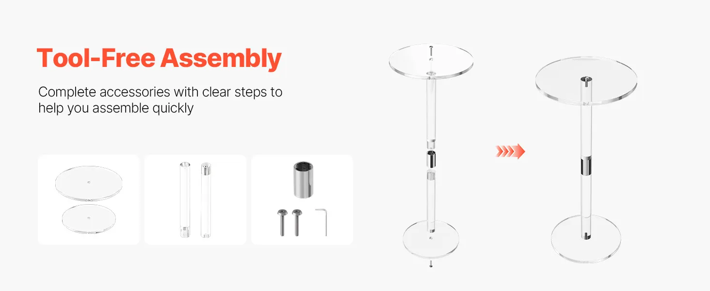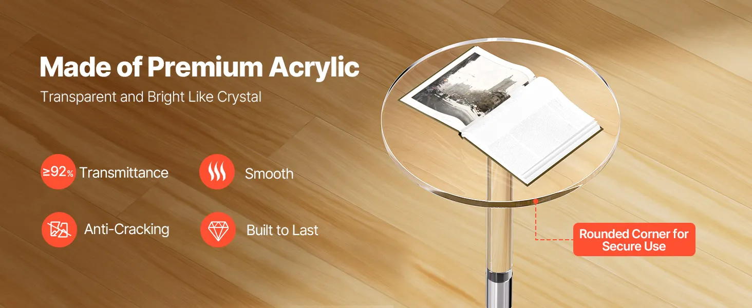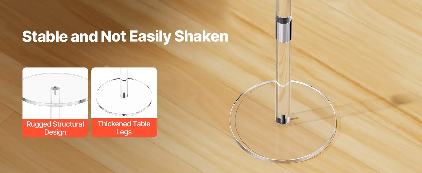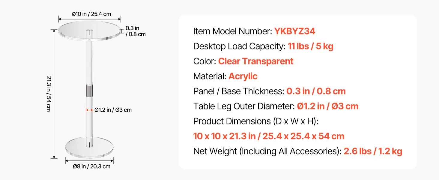 Akrylový príručný stolík okrúhly vrch, pevný stĺp, 25.4×25.4×54 cm