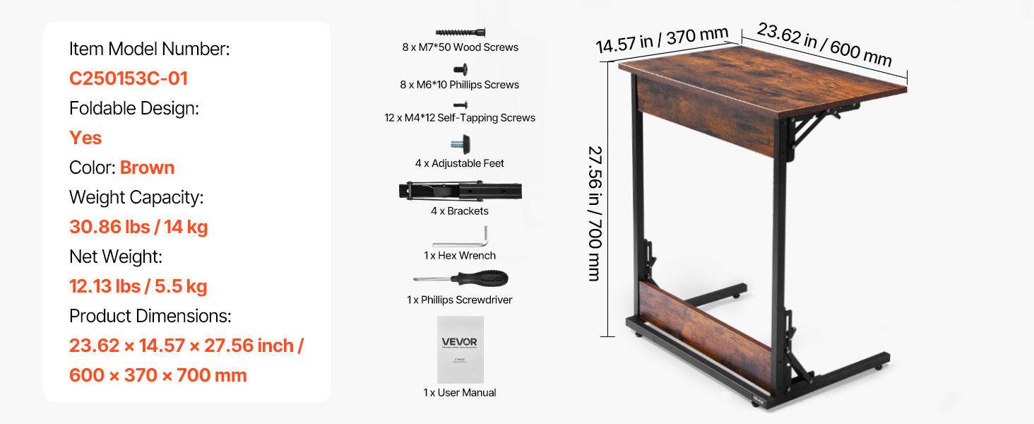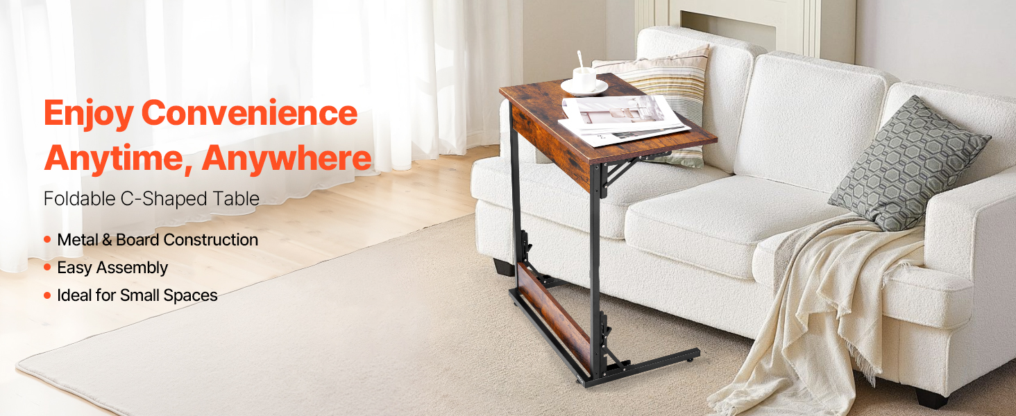 Tento bočný stolík v tvare písmena C s rozmermi 23,62 x 14,57 x 27,56 palca (600 x 370 x 700 mm) sa zasúva pod pohovky a postele, čím šetrí miesto. Skladacia konštrukcia umožňuje jednoduché skladovanie, zatiaľ čo nastaviteľné nožičky chránia podlahy. Robustný kovový rám a hrubá drevotriesková doska udržia až 30,86 kg. Jednoduchá montáž sa hodí do každej miestnosti.