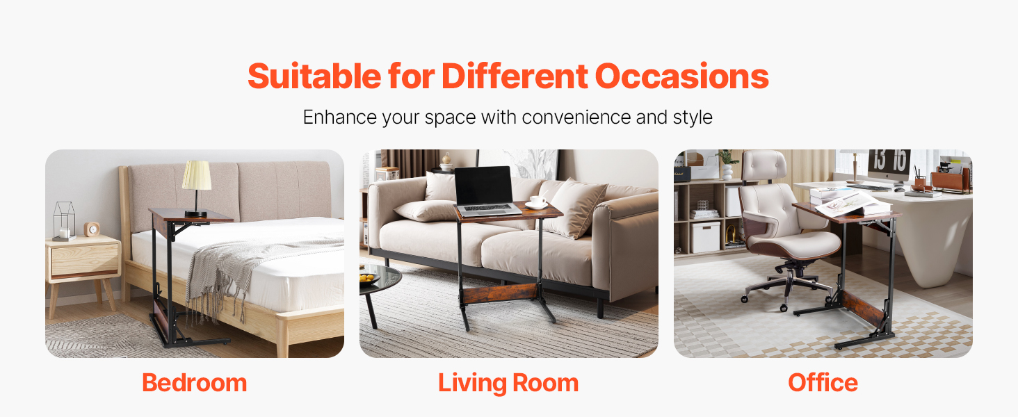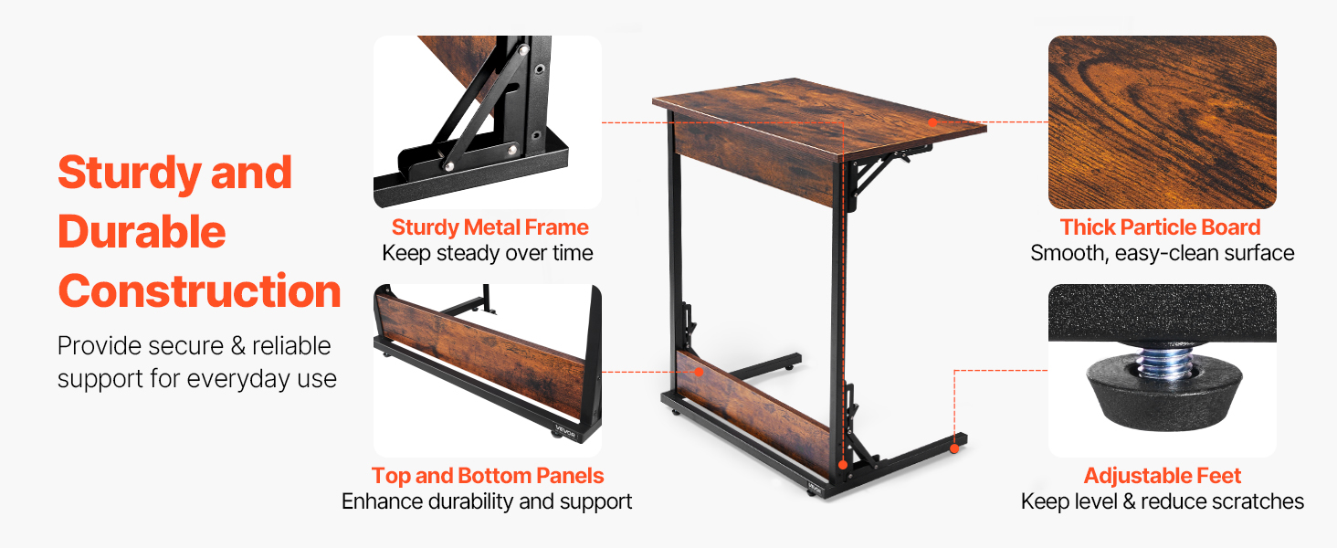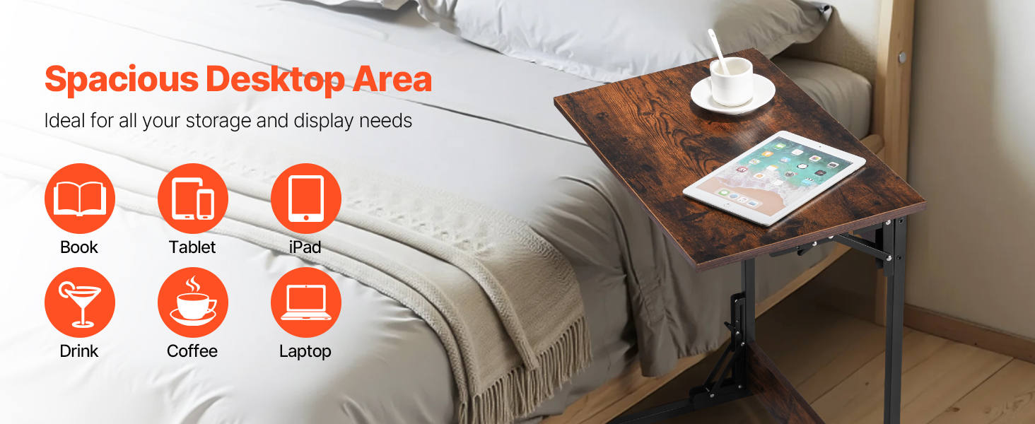VEVOR bočný stolík na notebook na pohovku má jednoduchý vzhľad, ktorý sa hodí k akémukoľvek interiéru. Ideálny ako nočný stolík na nevyhnutné veci, pohovka na diaľkové ovládače a nápoje alebo pracovný stôl na notebooky a súbory. Užívajte si väčšie pohodlie a moderný štýl kdekoľvek ho umiestnite.