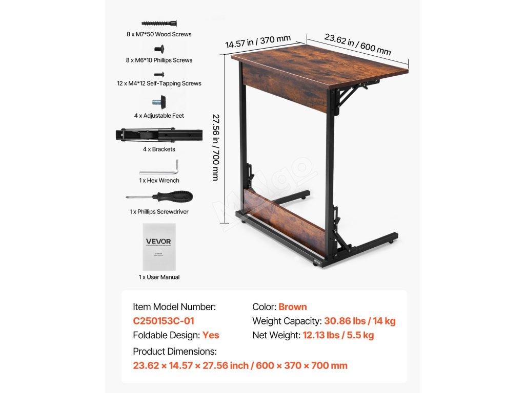 Tento bočný stolík v tvare písmena C s rozmermi 23,62 x 14,57 x 27,56 palca (600 x 370 x 700 mm) sa zasúva pod pohovky a postele, čím šetrí miesto. Skladacia konštrukcia umožňuje jednoduché skladovanie, zatiaľ čo nastaviteľné nožičky chránia podlahy. Robustný kovový rám a hrubá drevotriesková doska udržia až 30,86 kg. Jednoduchá montáž sa hodí do každej miestnosti.