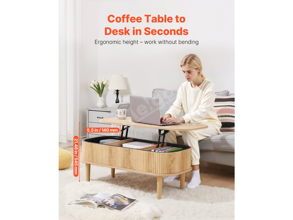 Tento multifunkčný konferenčný stolík s odklápacou doskou kombinuje štýl a funkčnosť so skrytým úložným priestorom, vďaka čomu je ideálny ako riešenie pre každodenné ukladanie vecí. Vďaka hladkému zdvíhaciemu mechanizmu sa ľahko premení na dočasný pracovný stôl alebo jedálenský stôl a bez námahy sa prispôsobí vašim potrebám – či už relaxujete, pracujete z domu alebo si vychutnávate neformálne jedlo v obývacej izbe.