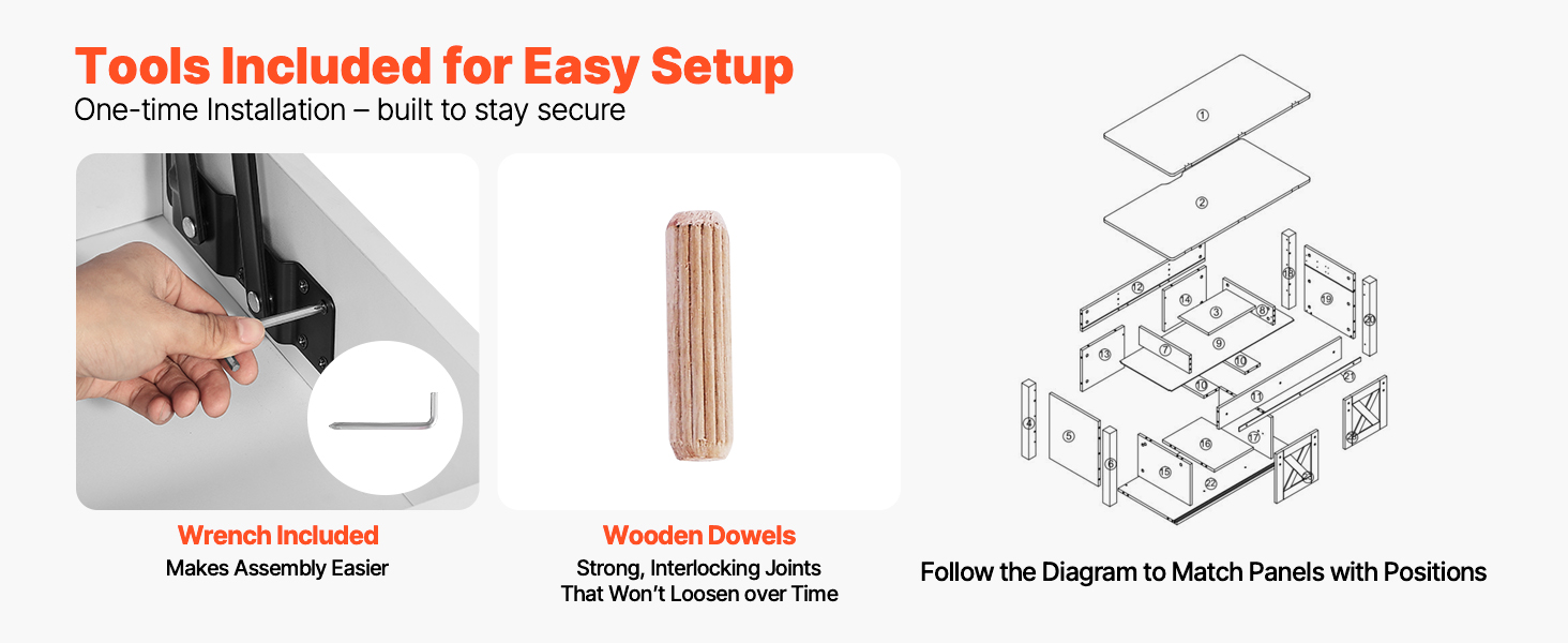 Súčasťou balenia je všetok potrebný hardvér na bezproblémové zostavenie - navyše praktický kľúč a drevené hmoždinky, ktoré zabezpečia pevnú a dlhotrvajúcu montáž už pri prvej inštalácii.