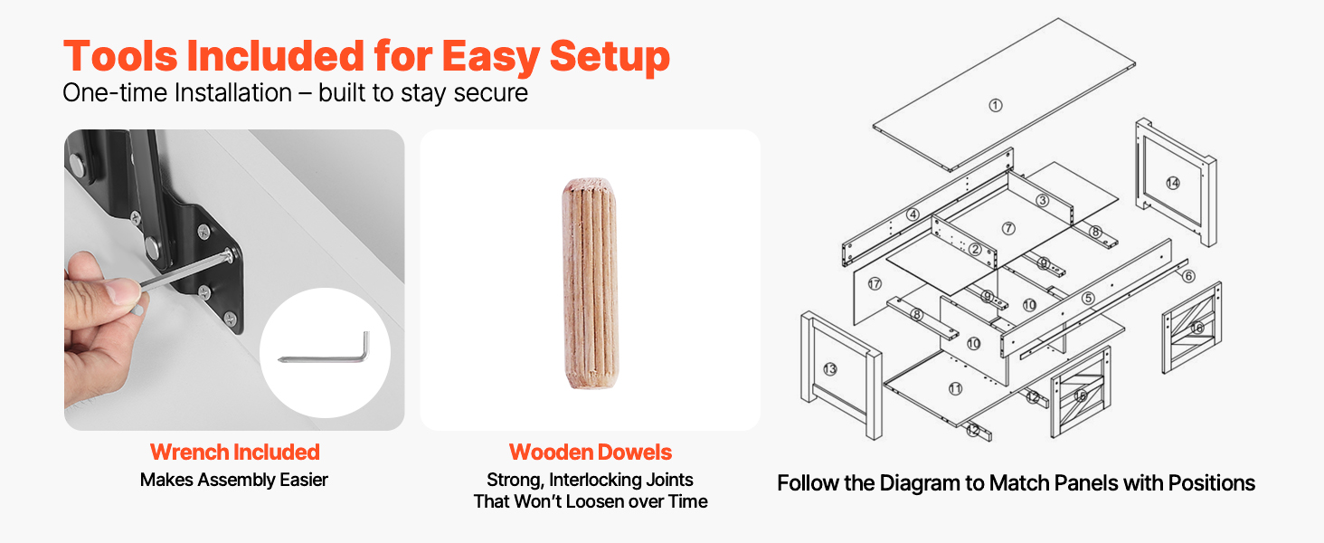 Súčasťou balenia je všetok potrebný hardvér na bezproblémové zostavenie - navyše praktický kľúč a drevené hmoždinky, ktoré zabezpečia pevnú a dlhotrvajúcu montáž už pri prvej inštalácii.
