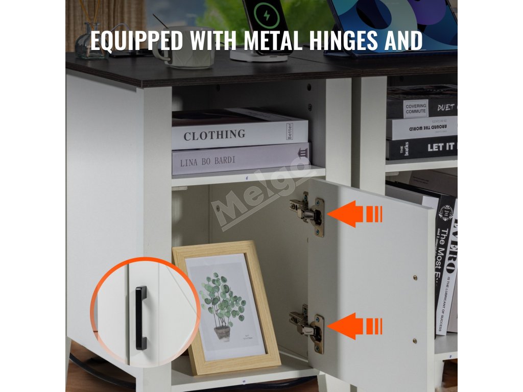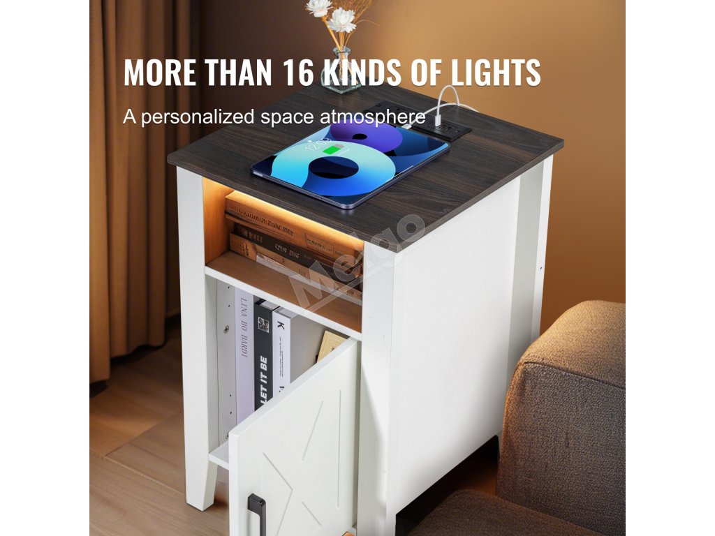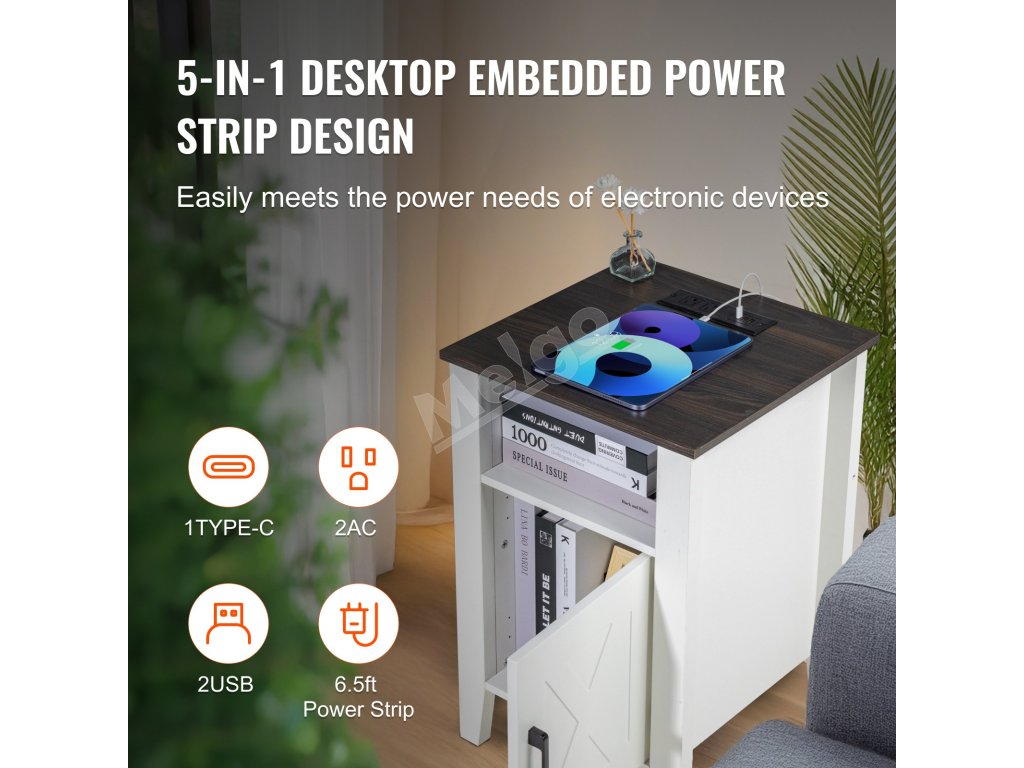 Tento koncový stolík do domácnosti ponúka zabudované nabíjanie s 2 zásuvkami na striedavý prúd, 2 portami USB a 1 portom typu C, ktoré poskytujú pohodlie pre všetky vaše elektronické zariadenia. Pomáha organizovať knihy, dekoratívne predmety a pomôcky, vďaka čomu udrží váš priestor čistý a uprataný.