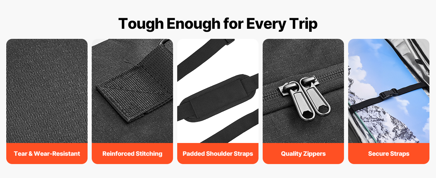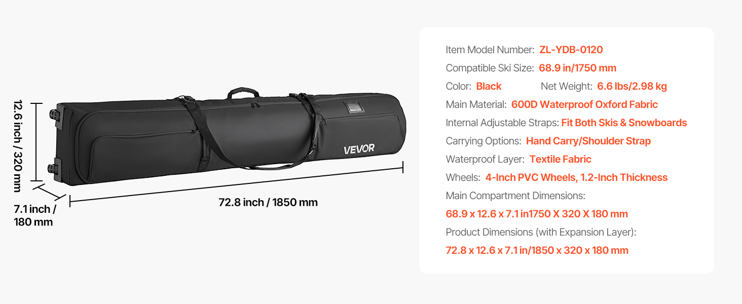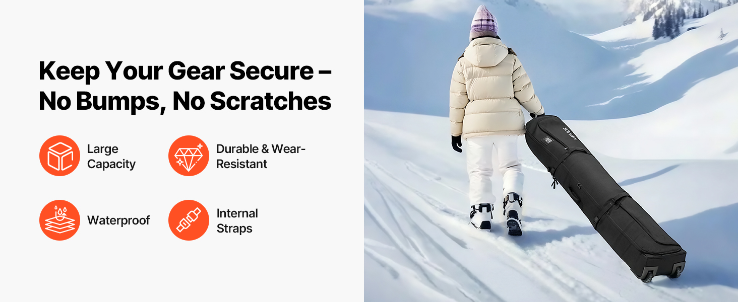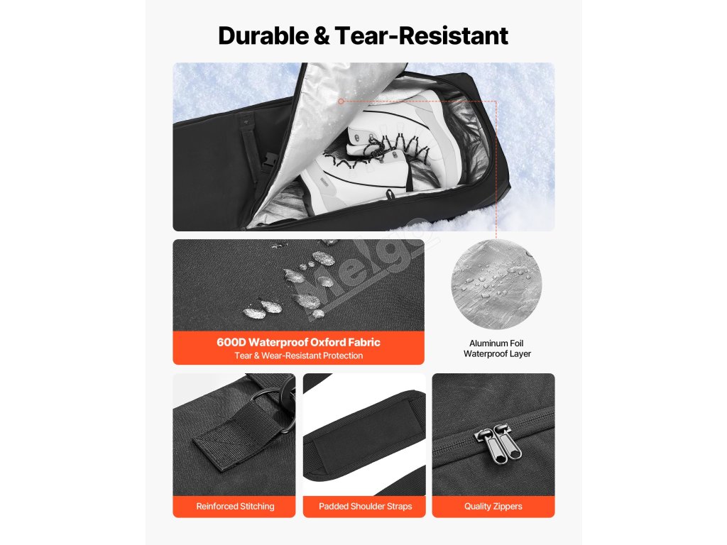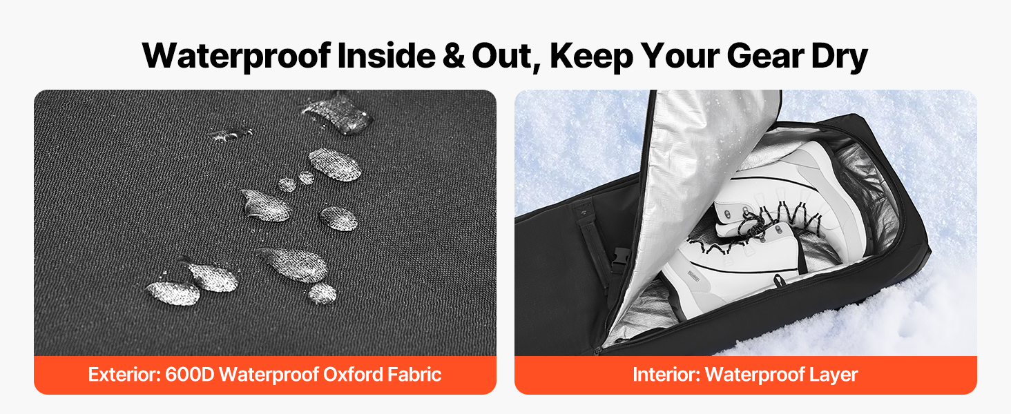 Táto taška na lyže s kolieskami je vyrobená z ľahkej nepremokavej tkaniny 600D Oxford s ochrannou podšívkou, ktorá zabraňuje vniknutiu snehu a dažďa, chráni vašu výbavu pred vlhkosťou a hrdzou a zároveň uľahčuje prenášanie tašky.