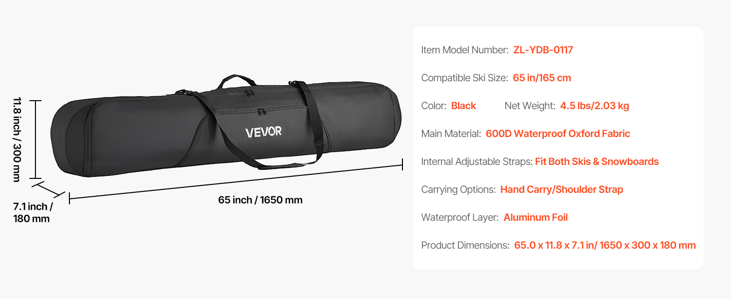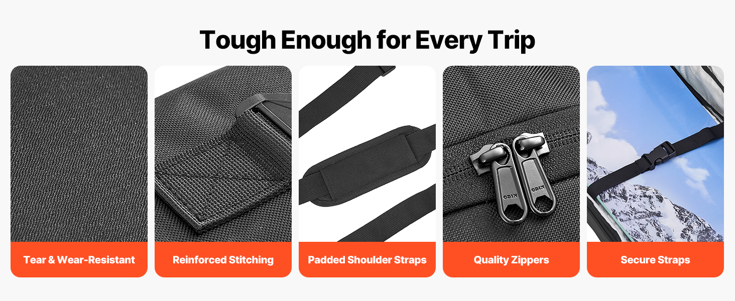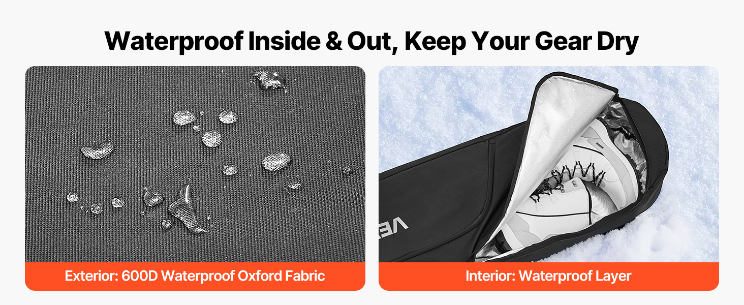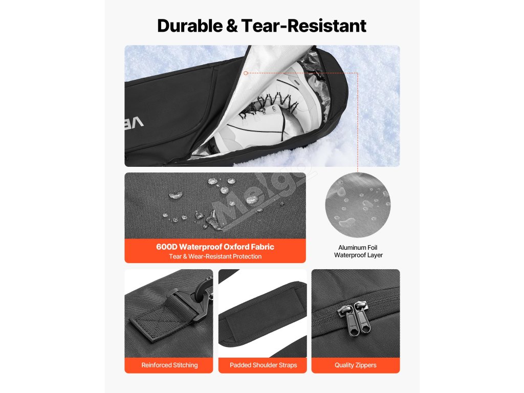 Táto taška na snowboard na cesty lietadlom, vyrobená z ľahkej nepremokavej tkaniny 600D Oxford s ochrannou podšívkou, zabraňuje prenikaniu snehu a dažďa, chráni vašu výbavu pred vlhkosťou a hrdzou a zároveň uľahčuje prenášanie tašky.