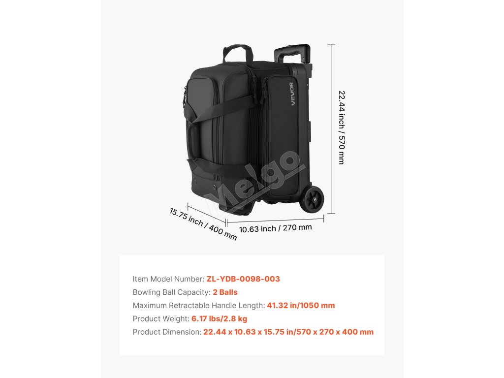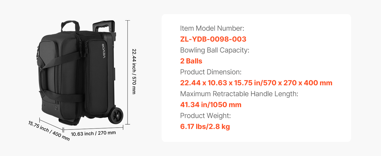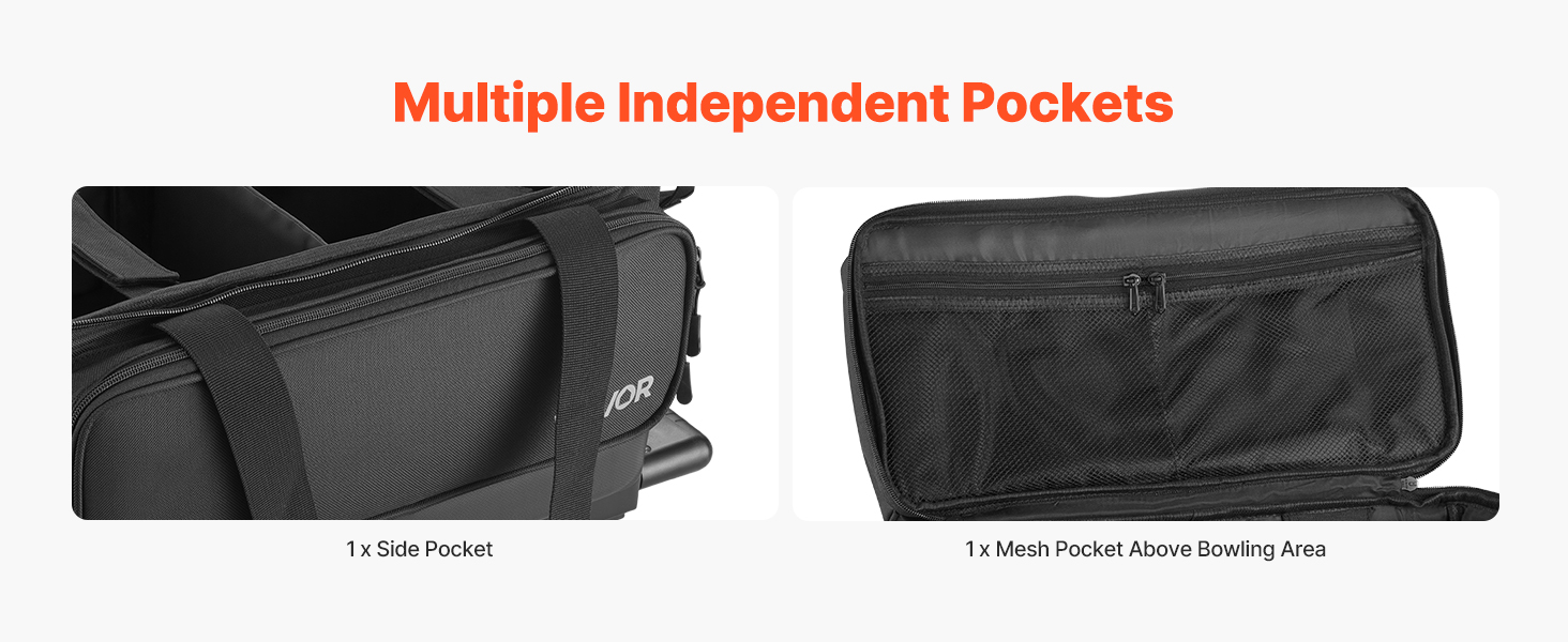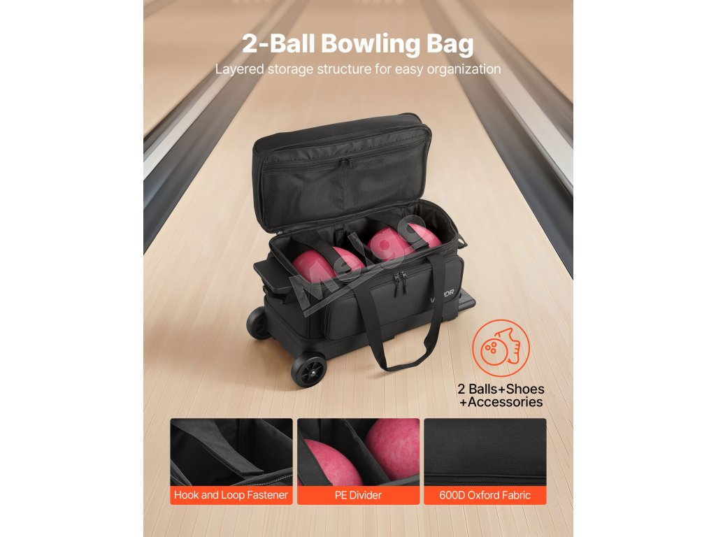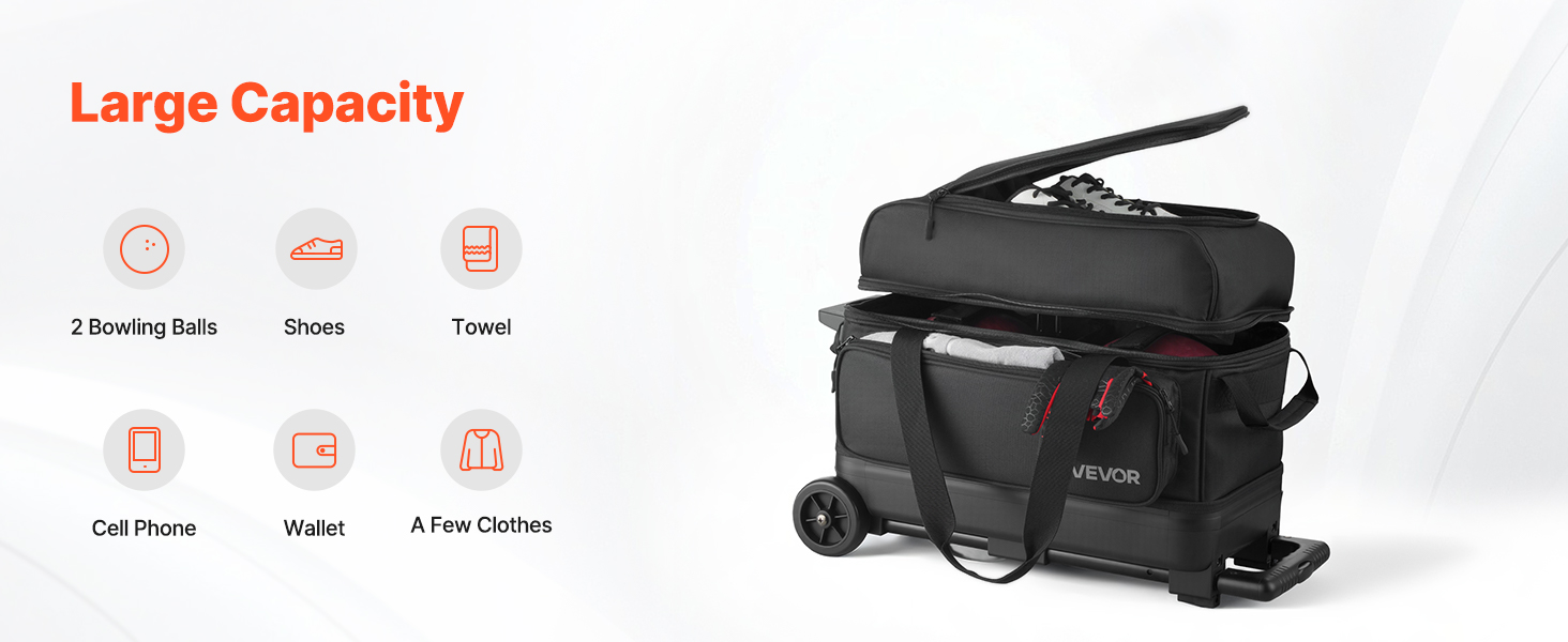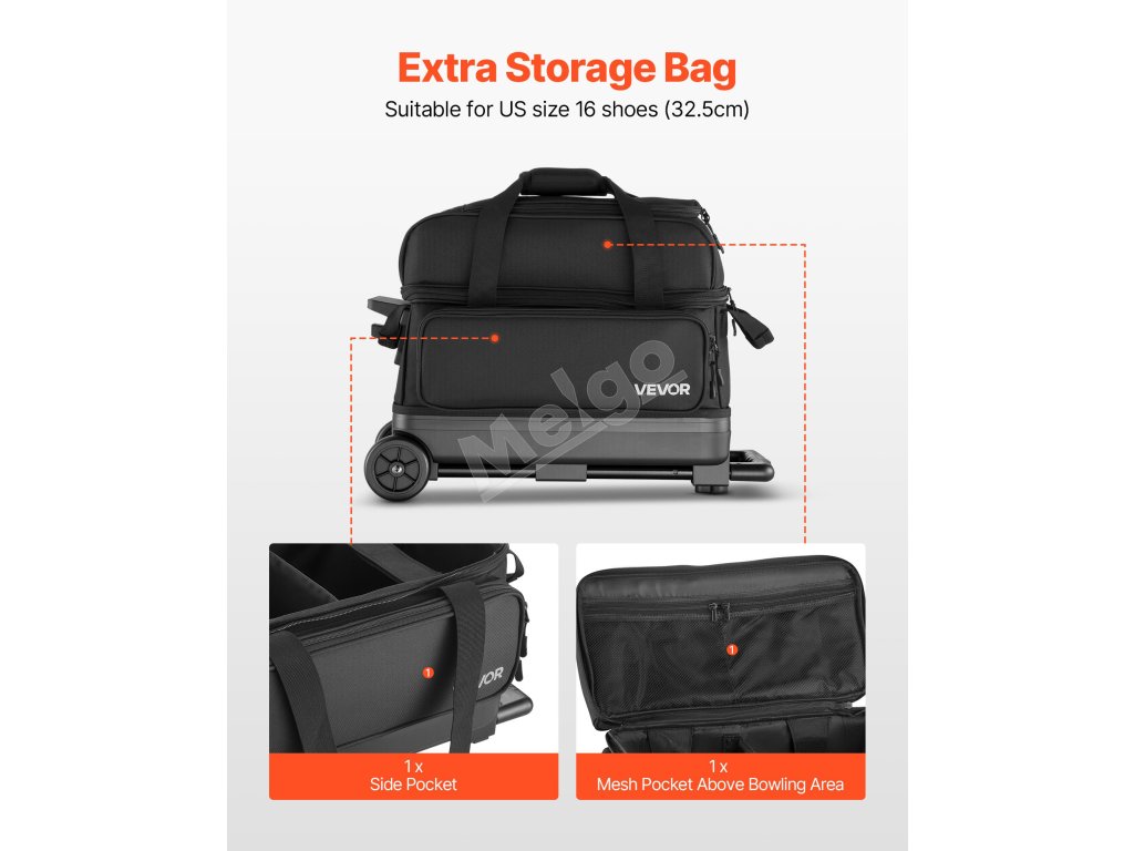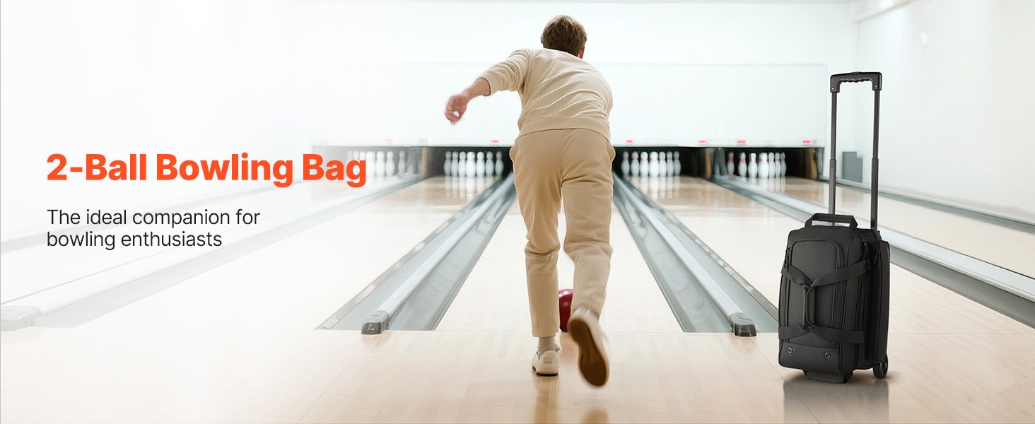 Naša bowlingová taška s kolieskami pojme 2 štandardné gule v hlavnom priestore, pričom v samostatnom priestore na topánky odolnom voči vlhkosti sa nachádza obuv veľkosti US 16. Horné sieťované vrecko poskytuje rýchly prístup k uterákom a výstroju, zatiaľ čo vonkajšie bočné vrecko uchováva telefón a kľúče, a to všetko v jednej taške.