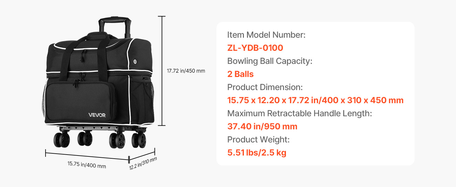 Taška na 2 bowlingové guľe s kolieskami, topánky US 16, rukoväť 950 mm