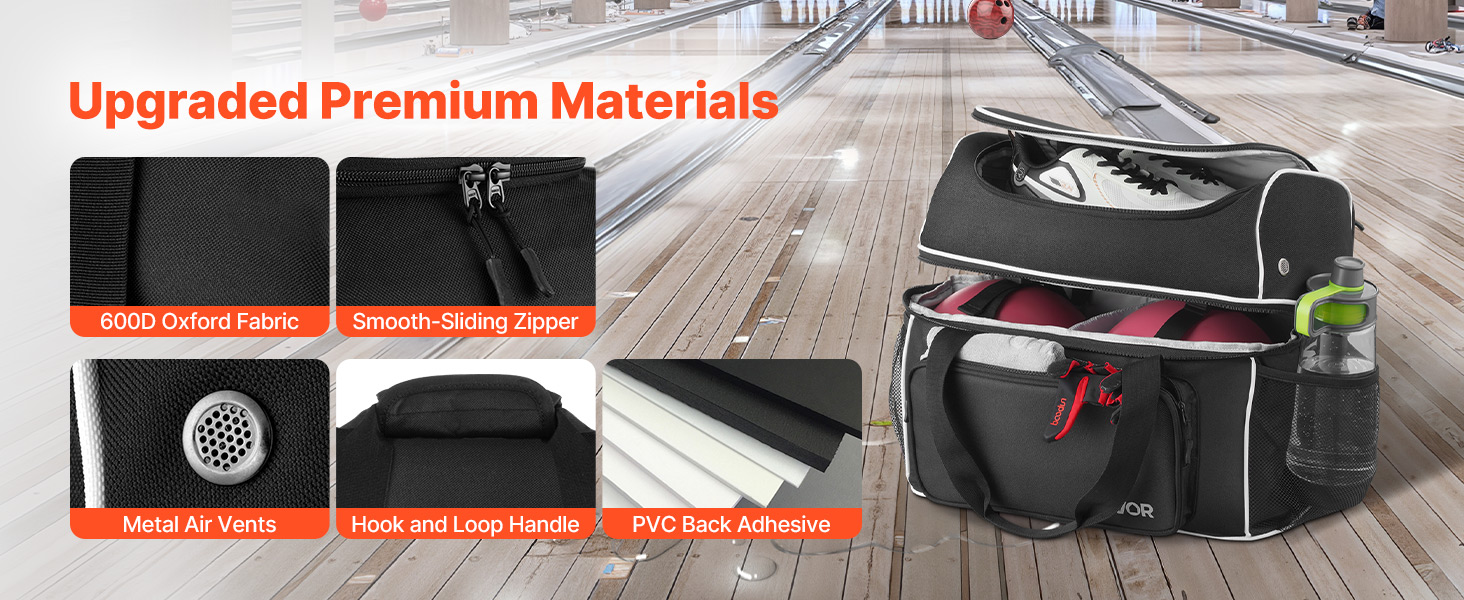 Naša taška na 2 bowlingové gule poskytuje spoľahlivé uloženie vašej bowlingovej výstroje. Odolná tkanina Oxford 600D s PVC povrchovou úpravou odoláva nepriaznivému počasiu. Dno je vybavené 5 mm doskou odolnou proti nárazom z PE. Dvojitý kovový zips a zosilnené švy zaručujú odolnosť.