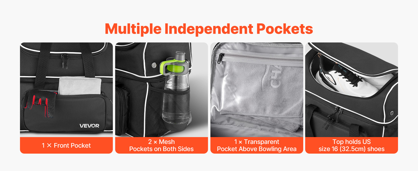 Táto taška na bowling s kolieskami má rôzne typy vreciek: 1 predné vrecko, 2 sieťované vrecká na oboch stranách a 1 priehľadné vrecko nad priestorom na bowlingové gule. Nastaviteľná PE priehradka umožňuje jednoduché usporiadanie priestoru.