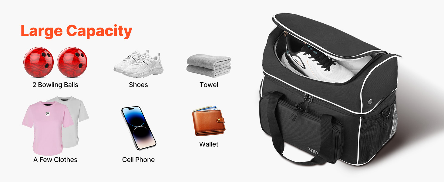 Naša taška na bowling s kolieskami pojme 2 štandardné gule v hlavnom priestore a má samostatný priestor na topánky odolný proti vlhkosti pre topánky veľkosti 16 (americká veľkosť). Horné sieťované vrecko umožňuje rýchly prístup k uterákom a výstroju, zatiaľ čo vonkajšie bočné vrecko pojme váš telefón a kľúče, všetko v jednej taške.