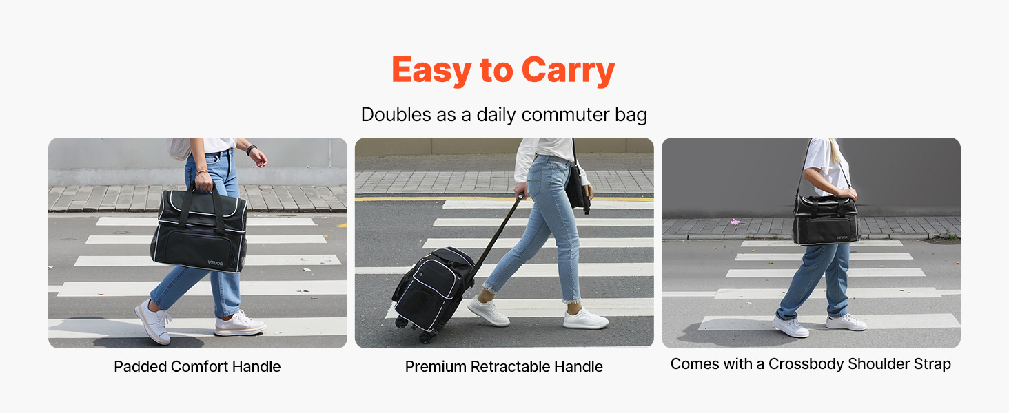 Nastaviteľná teleskopická rukoväť a rukoväť na suchý zips na kolieskovej taške na bowling umožňujú nosenie aj ťahanie, čím sa zvyšuje mobilita o 57 %.
