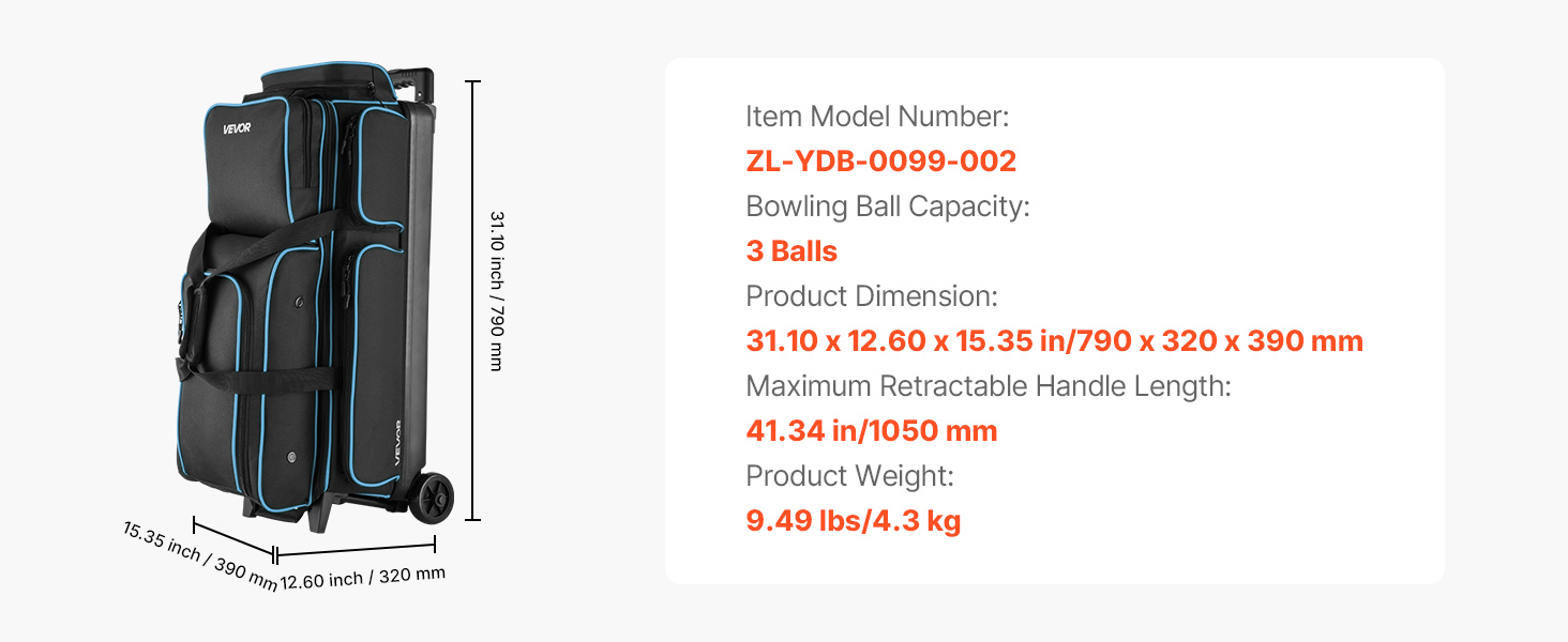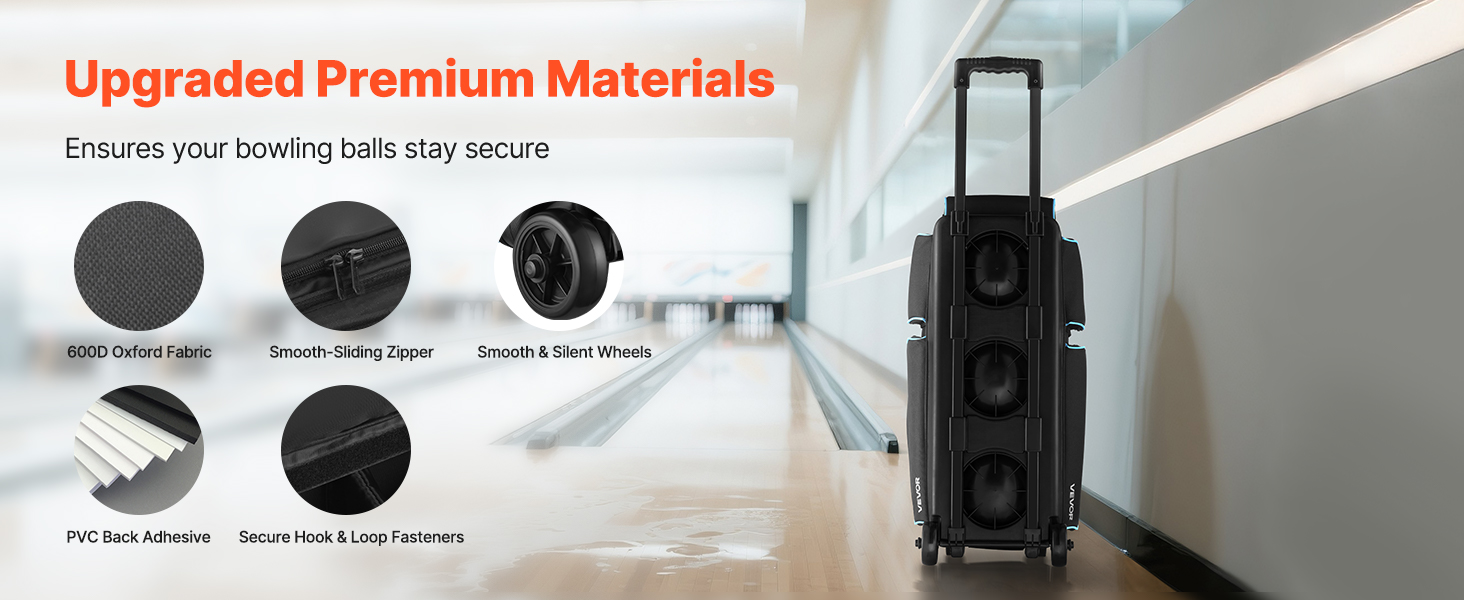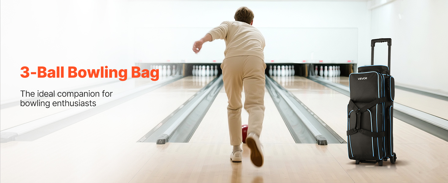 Naša bowlingová taška s kolieskami pojme 3 štandardné gule v hlavnom priestore, pričom v samostatnom priestore na topánky odolnom voči vlhkosti sa nachádza obuv veľkosti US 16. Horné sieťované vrecko poskytuje rýchly prístup k uterákom a výstroju, zatiaľ čo vonkajšie bočné vrecko uchováva telefón a kľúče.