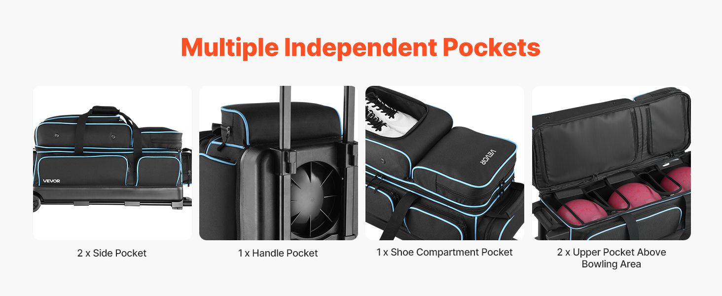 Táto bowlingová taška s kolieskami má rôzne typy vreciek: 2 bočné vrecká, 1 vrecko na rukoväť, 1 vrecko na topánky a 2 horné vrecká nad bowlingovou plochou. Nastaviteľná PE priehradka umožňuje jednoduché rozdelenie úložných priestorov.