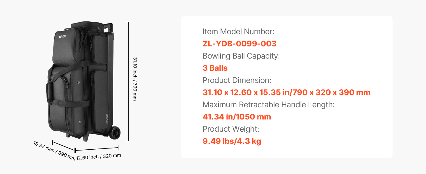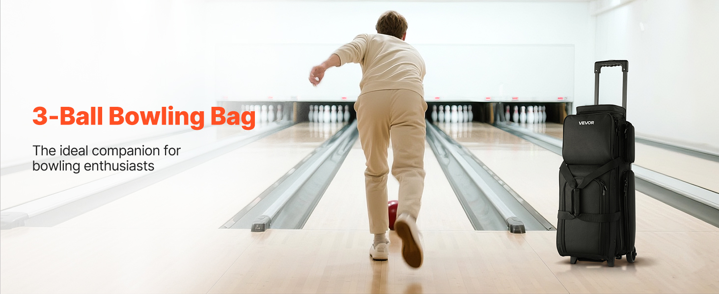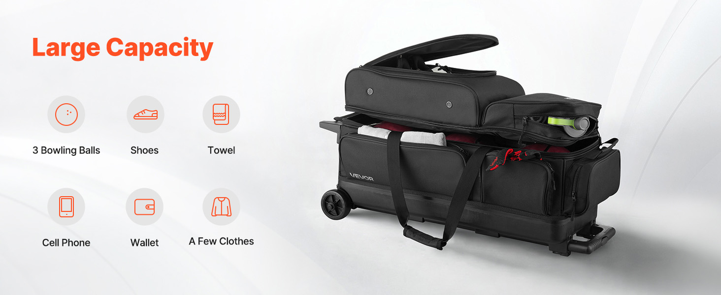 Naša bowlingová taška s kolieskami pojme 3 štandardné gule v hlavnej priehradke, pričom v samostatnej priehradke na topánky odolnej proti vlhkosti sa nachádza obuv veľkosti US 16. Horné sieťované vrecko poskytuje rýchly prístup k uterákom a výstroju, zatiaľ čo vonkajšie bočné vrecko uchováva telefón a kľúče.