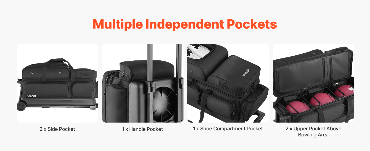 Táto bowlingová taška s kolieskami má rôzne typy vreciek: 2 bočné vrecká, 1 vrecko na rukoväť, 1 vrecko na topánky a 2 horné vrecká nad bowlingovou plochou. Nastaviteľná PE priehradka umožňuje jednoduché rozdelenie úložných priestorov.