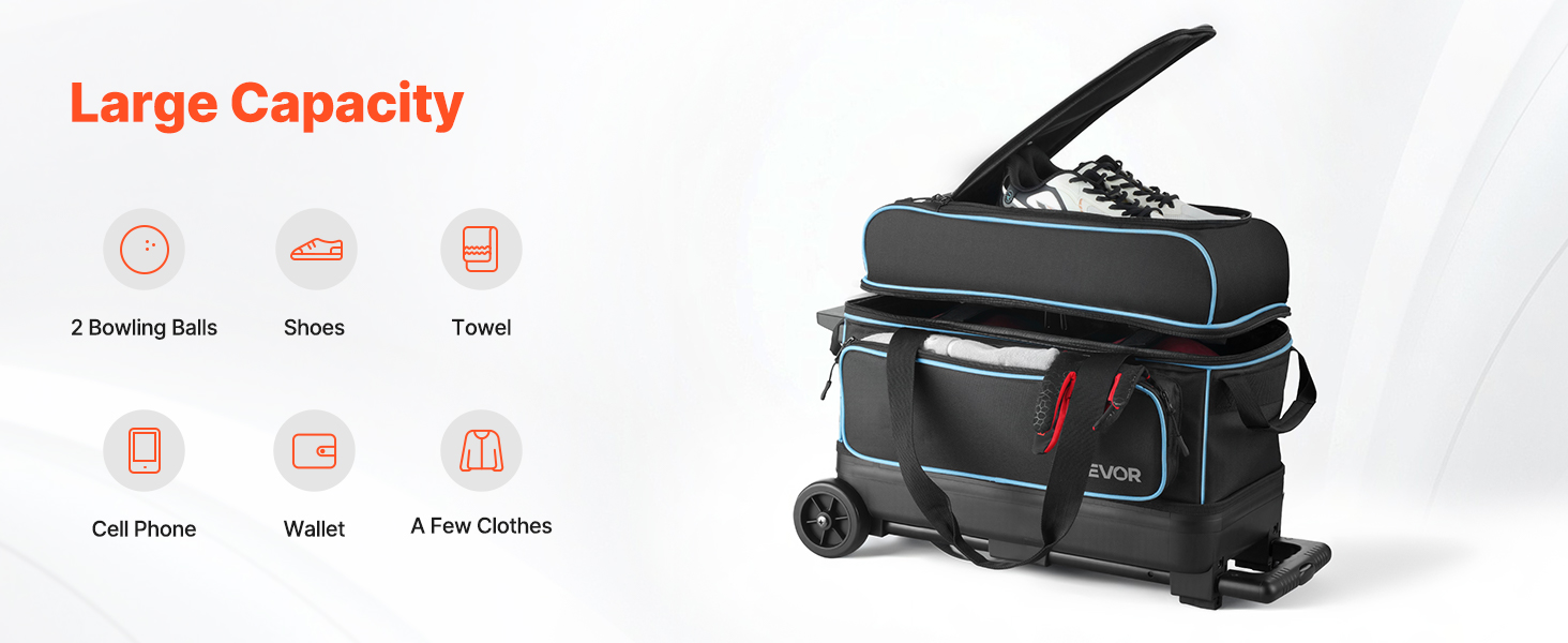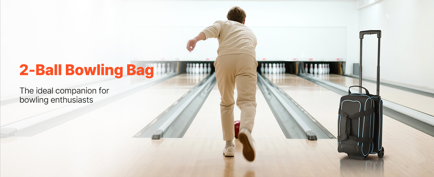 Naša bowlingová taška s kolieskami pojme 2 štandardné gule v hlavnom priestore, pričom v samostatnom priestore na topánky odolnom voči vlhkosti sa nachádza obuv veľkosti US 16. Horné sieťované vrecko poskytuje rýchly prístup k uterákom a výstroju, zatiaľ čo vonkajšie bočné vrecko uchováva telefón a kľúče, a to všetko v jednej taške.