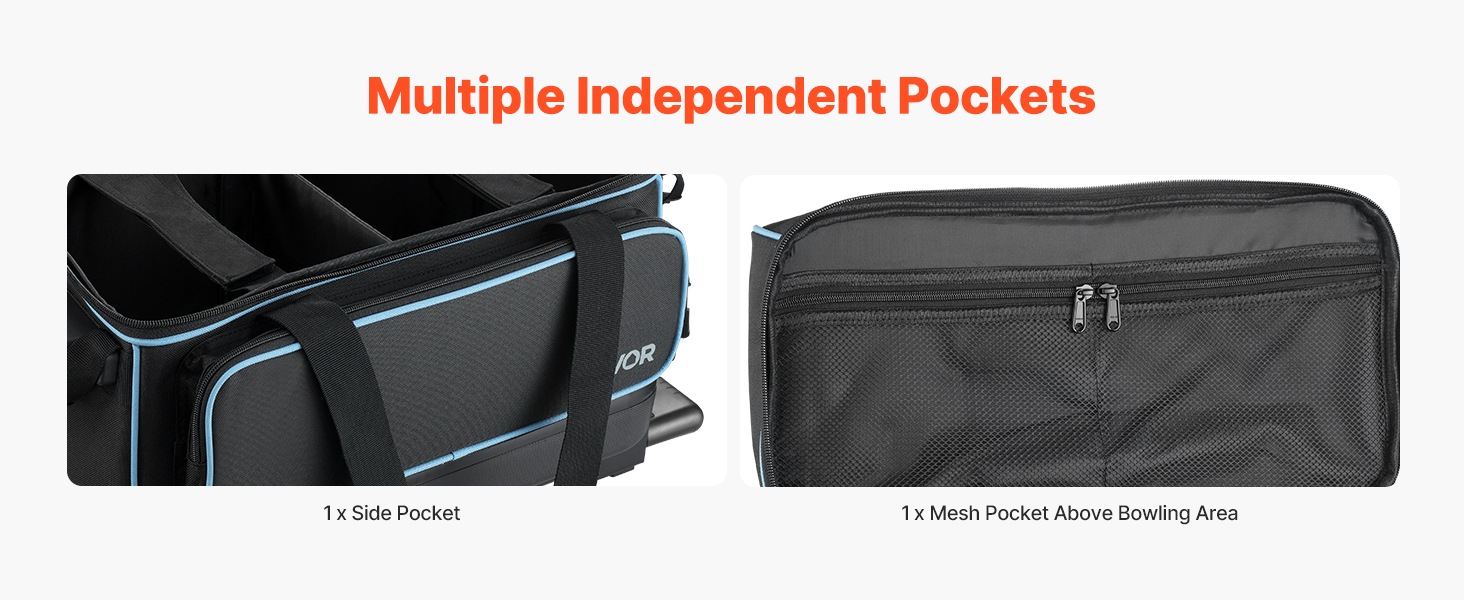 Táto bowlingová taška s kolieskami je vybavená rôznymi typmi vreciek: 1 bočné vrecko a 1 sieťované vrecko nad bowlingovou plochou. Nastaviteľná PE priehradka umožňuje jednoduché rozdelenie úložného priestoru.