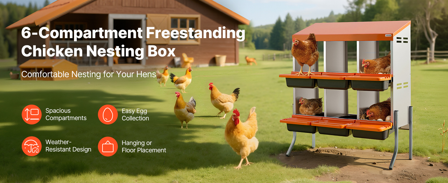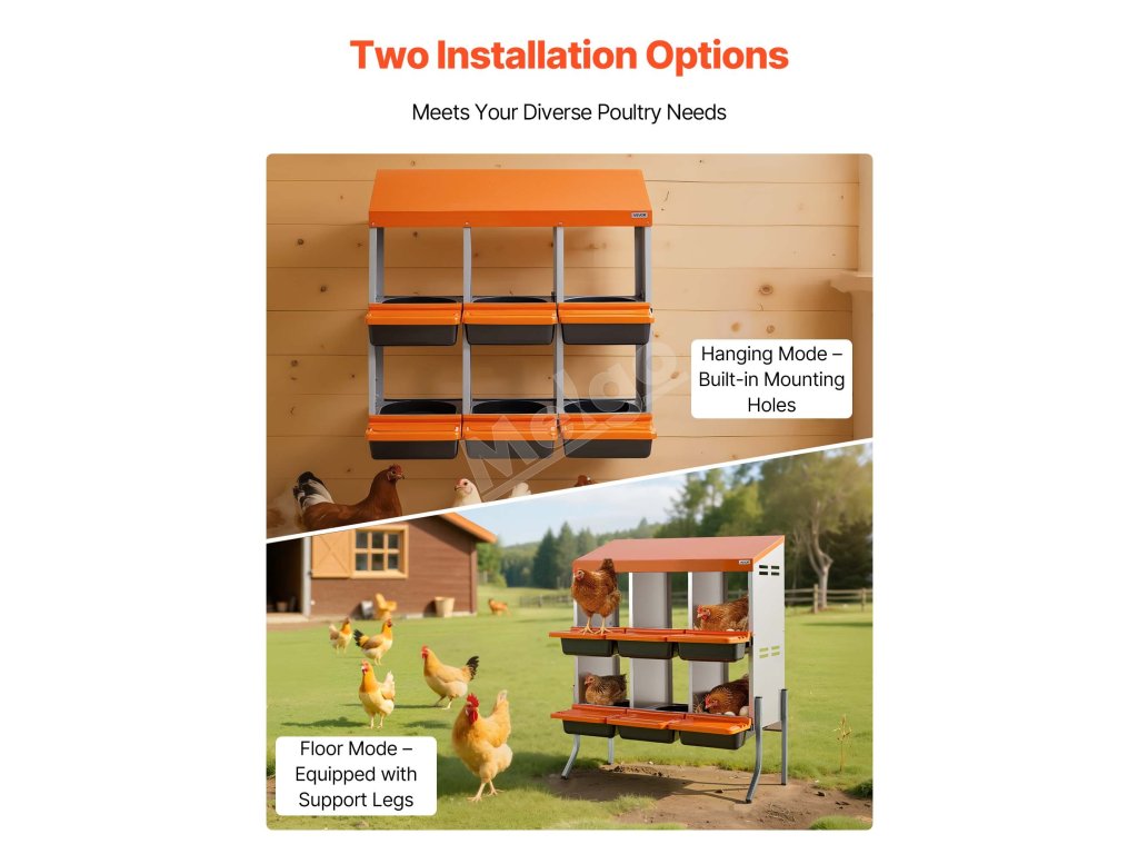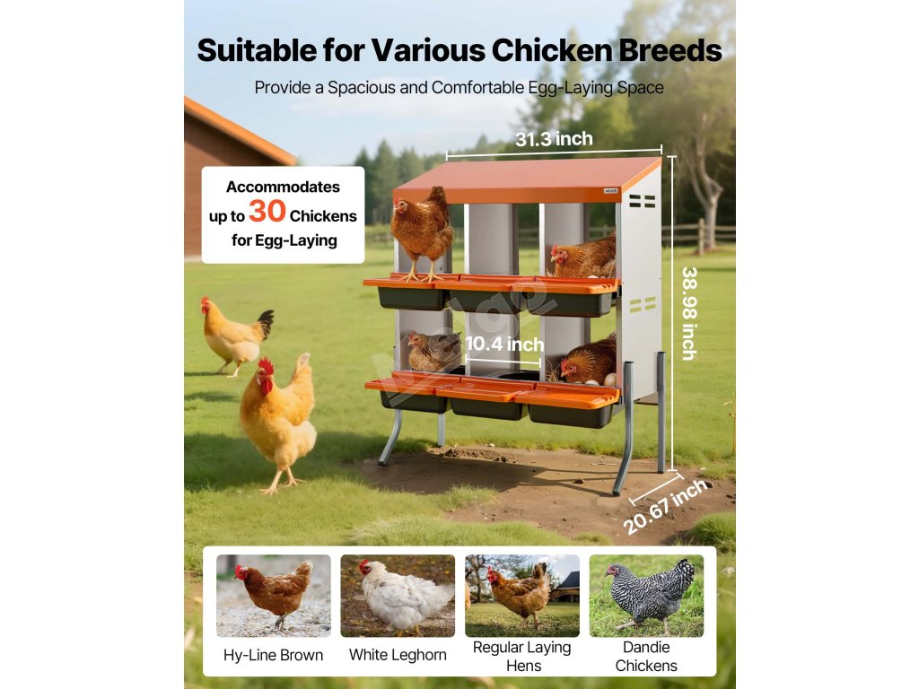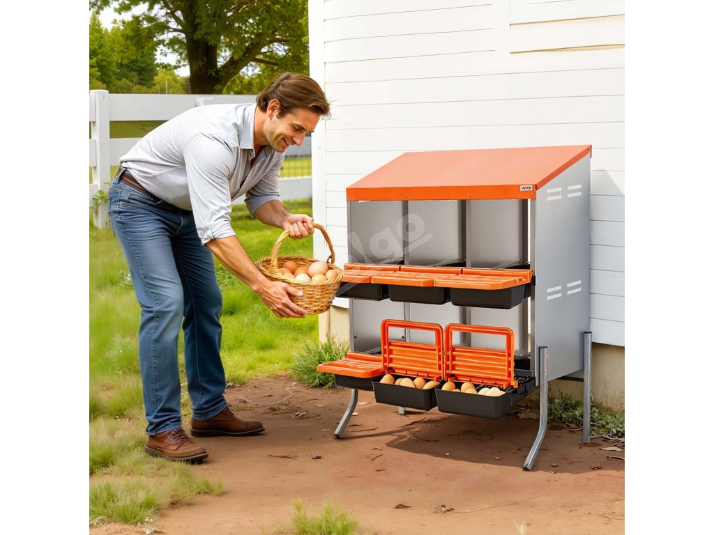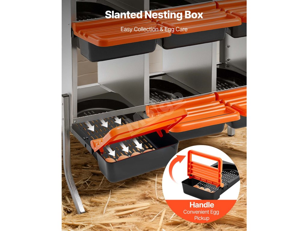 Tieto boxy na znášanie kurčiat sú navrhnuté s dostatočným priestorom a sú vhodné pre rôzne kŕdle. Každý vták má k dispozícii súkromný, pohodlný priestor na znášanie, čo podporuje vyššiu znášku a kvalitu vajec. Vďaka štyrom robustným oporným nohám zostáva konštrukcia stabilná a zároveň sa ľahko premiestňuje, čo ponúka flexibilitu pre rôzne miesta.