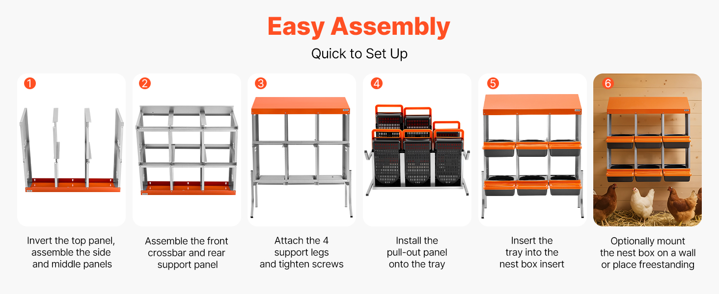 Nosnice pre sliepky sa rýchlo a jednoducho inštalujú. Súčasťou balenia je návod na použitie a všetko potrebné príslušenstvo. Jednoducho postupujte podľa návodu na rýchle a jednoduché nastavenie.