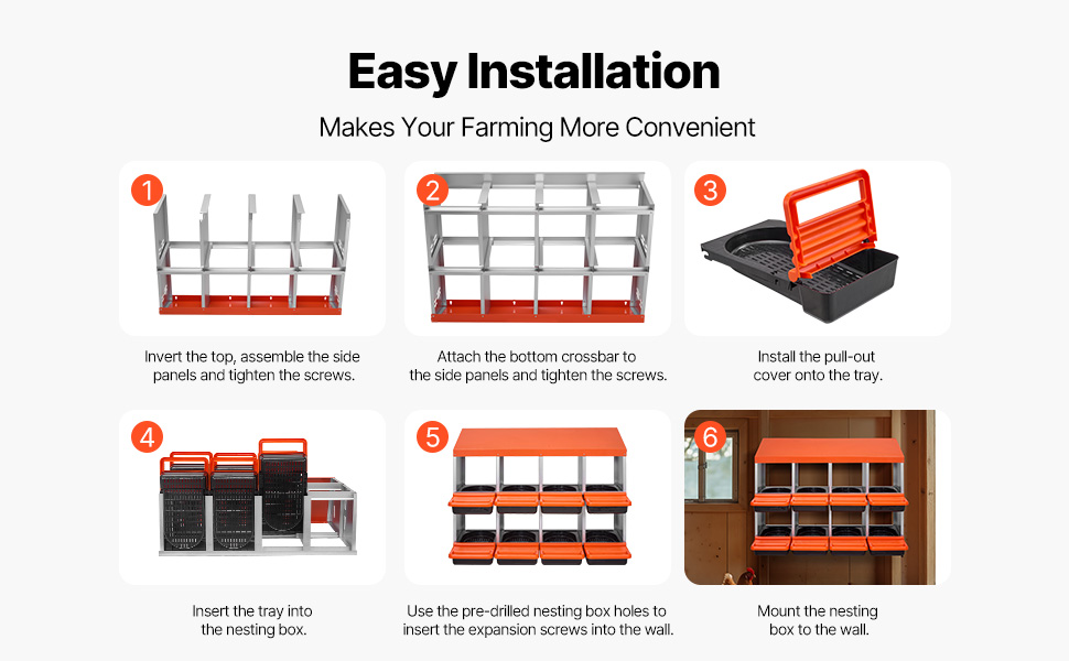 Naše hniezdne boxy pre sliepky pripravené na použitie sa ľahko a rýchlo inštalujú, čím sa výrazne predchádza technickému prahu inštalácie a ľahko sa zvyšuje efektívnosť chovu. Rozlúčte sa so zložitou montážou!