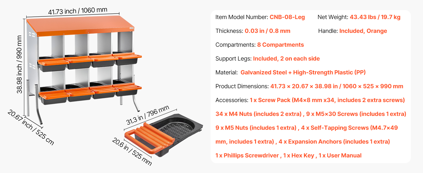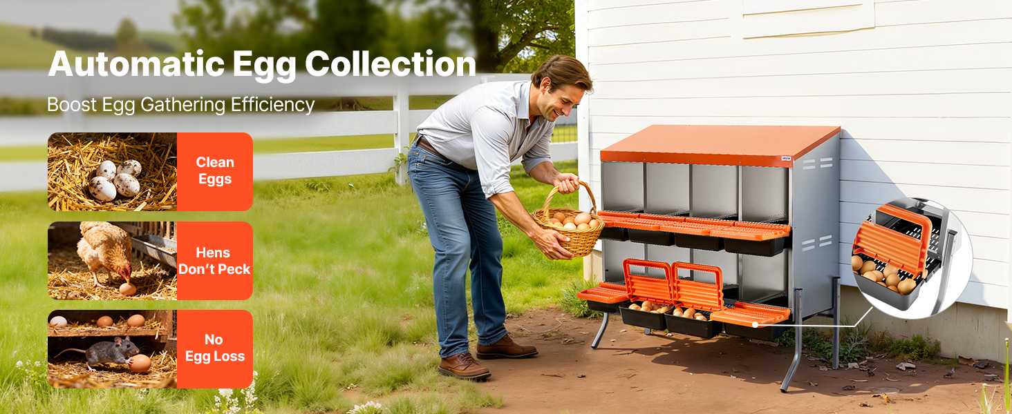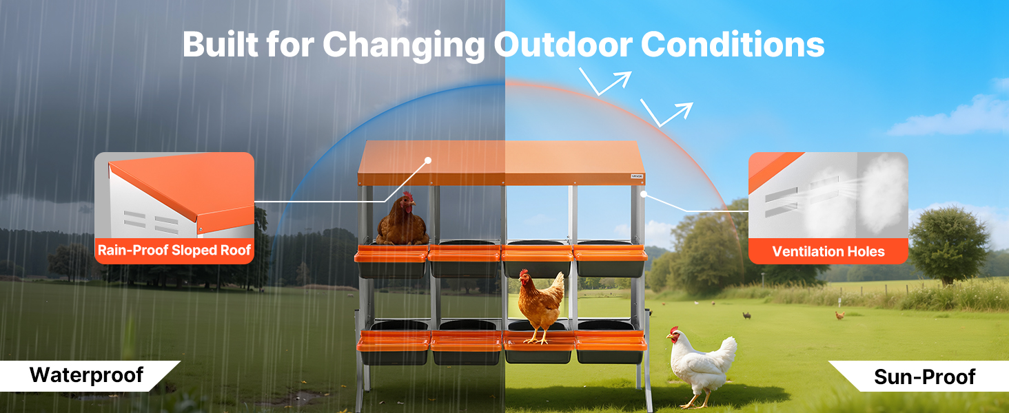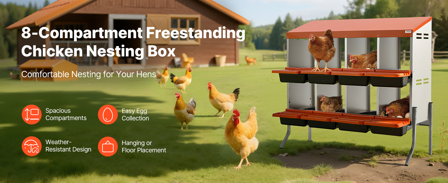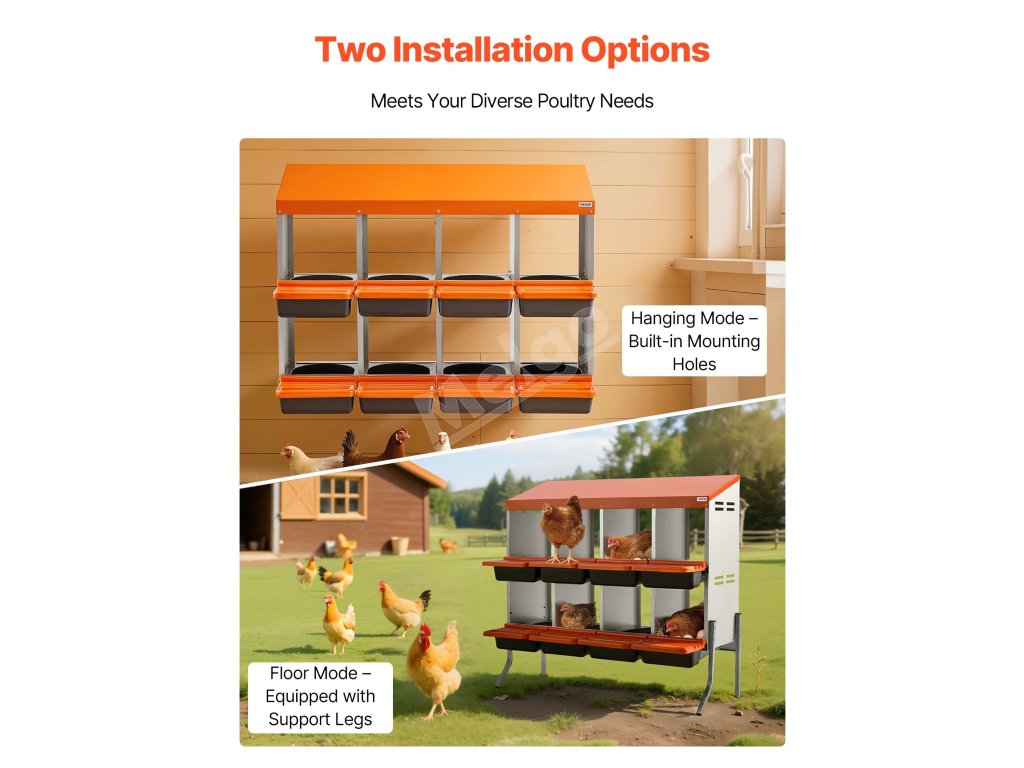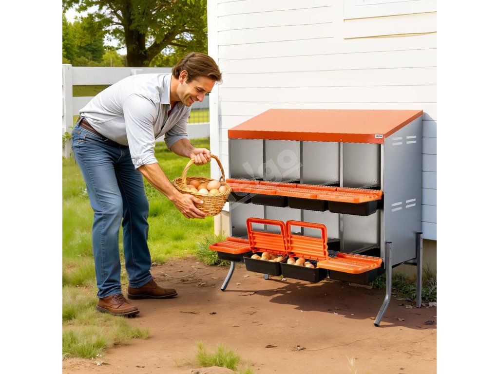 Tieto boxy na znášanie kurčiat sú navrhnuté s dostatočným priestorom a sú vhodné pre rôzne kŕdle. Každý vták má k dispozícii súkromný, pohodlný priestor na znášanie, čo podporuje vyššiu znášku a kvalitu vajec. Vďaka štyrom robustným oporným nohám zostáva konštrukcia stabilná a zároveň sa ľahko premiestňuje, čo ponúka flexibilitu pre rôzne miesta.