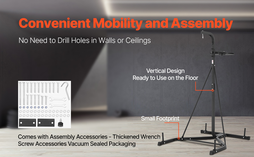 Stojan na vrecia s pieskom si nevyžaduje upevnenie k podlahe, stačí upevniť hlavný rám a nainštalovať boxovacie vrece. S naším návodom sa dá stojan zmontovať za niekoľko minút. Montážne náradie je súčasťou balenia a aj samostatná inštalácia ženami sa dá rýchlo vykonať.