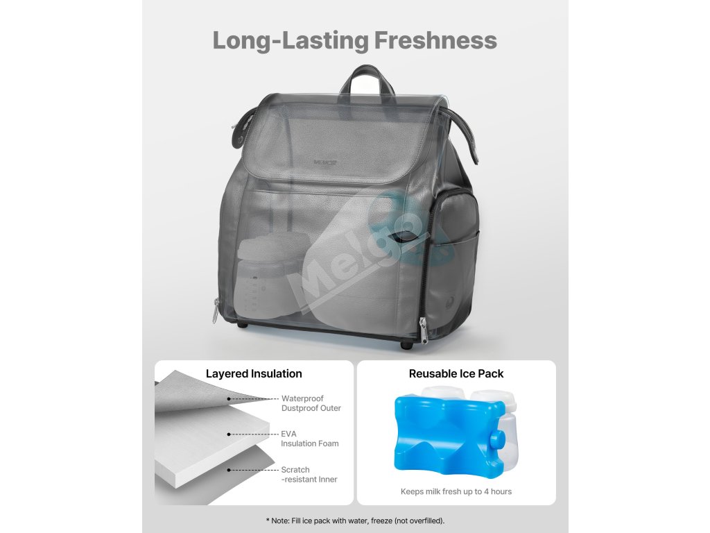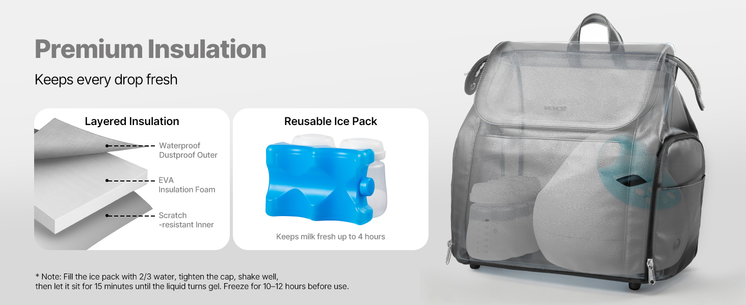 Priestor na uskladnenie mlieka je vybavený nepremokavým materiálom so silnou izoláciou, ktorá znižuje výmenu tepla s vonkajším prostredím. Vďaka priloženým balíčkom s ľadom naša cestovná taška na odsávačku materského mlieka udrží materské mlieko čerstvé až 4 hodiny.