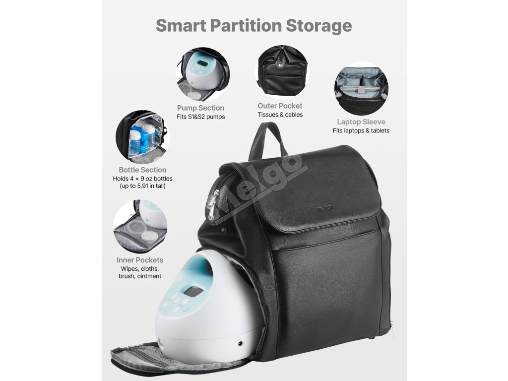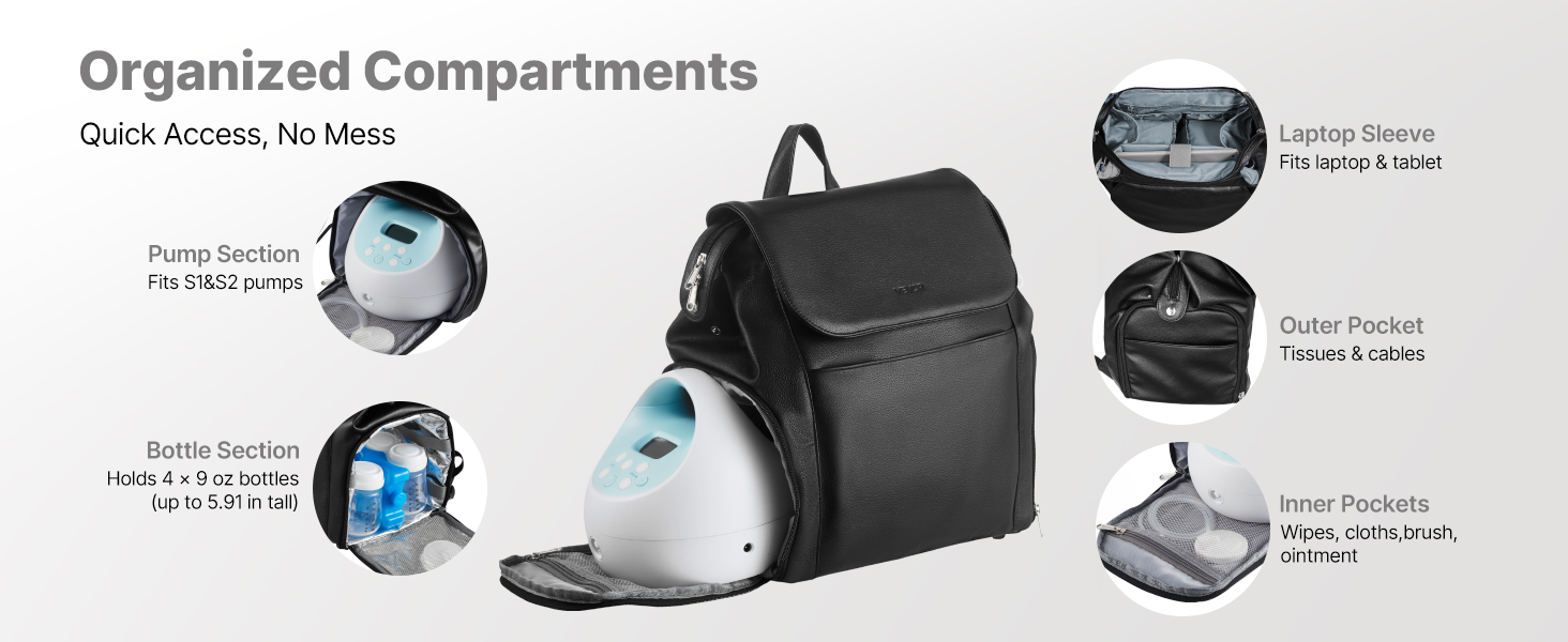 Taška na dojčenie obsahuje vnútorné aj vonkajšie vrecká na odsávačky, fľaše, plienky, utierky, notebook a ďalšie veci. Do predného vrecka sa zmestia nabíjačky a kefky, zatiaľ čo do bočných vreciek sa zmestia vreckovky alebo šnúrky.