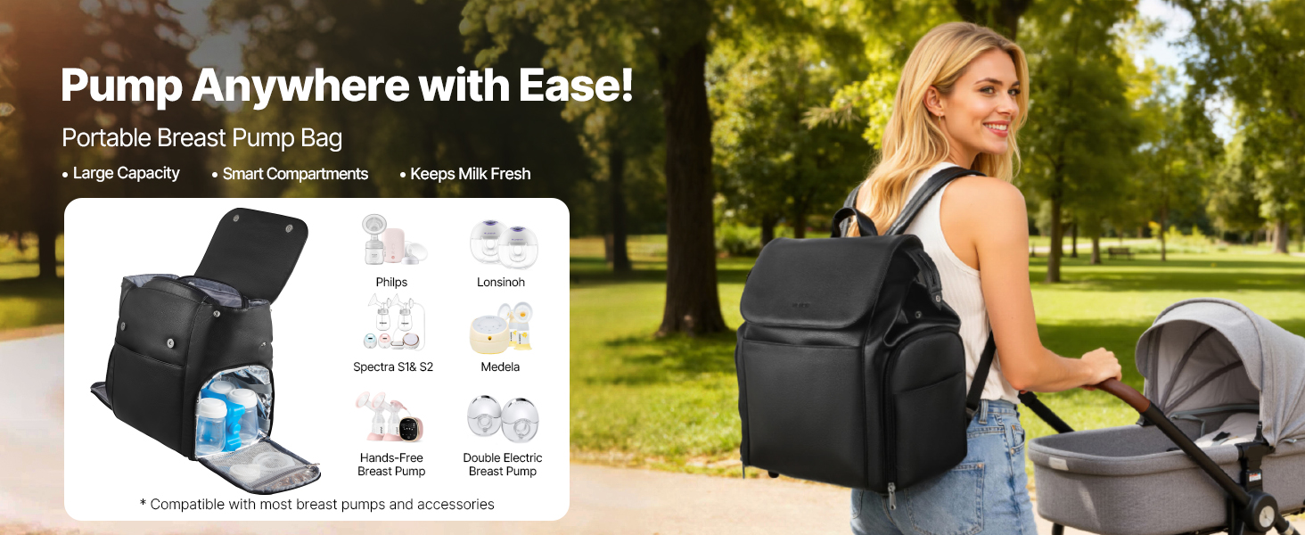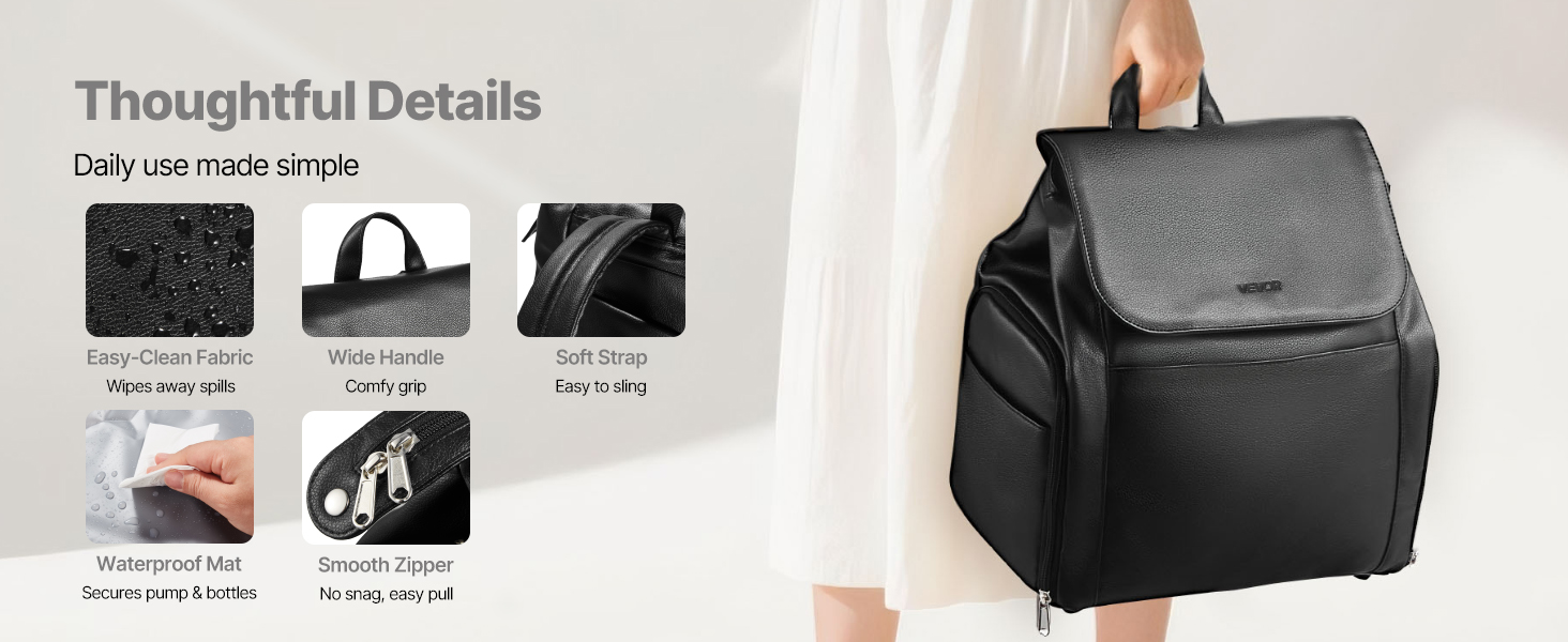 Široká rukoväť a polstrovaný popruh tašky na uskladnenie odsávačky materského mlieka umožňujú pohodlné prenášanie. Vodotesná podložka pomáha zabezpečiť fľaše pred únikom. Ľahko čistiteľná tkanina sa rýchlo utiera a hladké zipsy ľahko kĺžu.