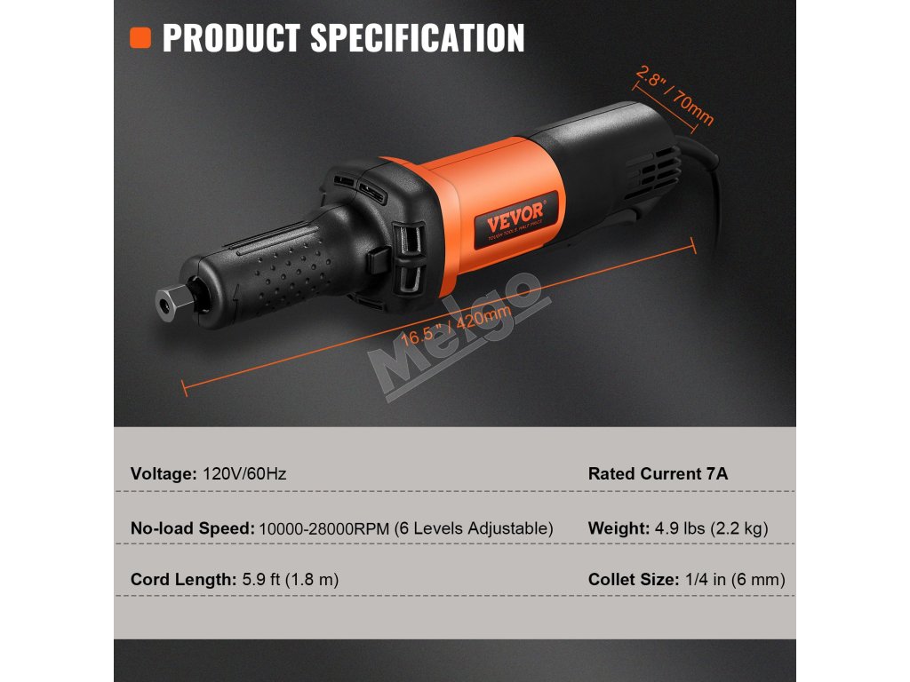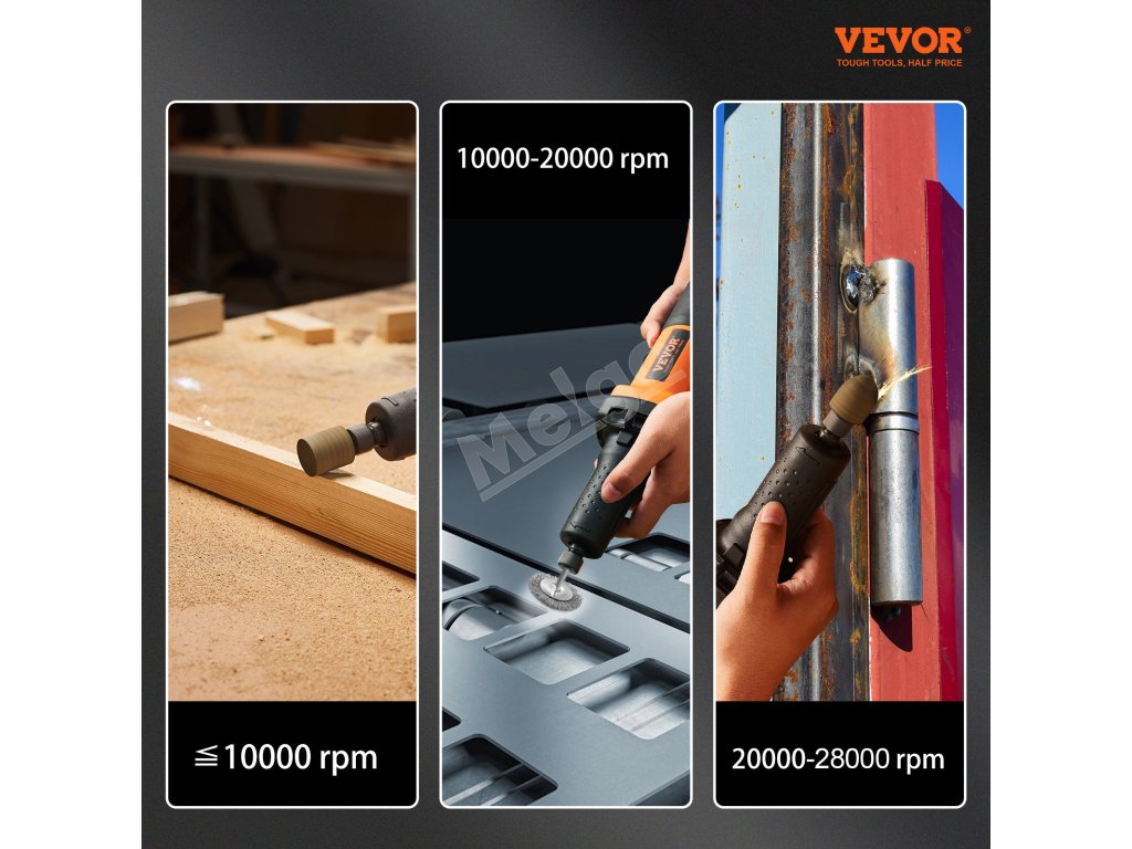 Stále vás trápia objemné a nepohodlné zápustkové brúsky? VEVOR bude ideálnou voľbou, ktorá vám umožní rozlúčiť sa s týmito problémami. Vďaka výkonnému motoru s otáčkami až 28 000 ot/min sú možnosti pri jej používaní neobmedzené. Svoju produktivitu a efektivitu môžete zvýšiť v priebehu okamihu.