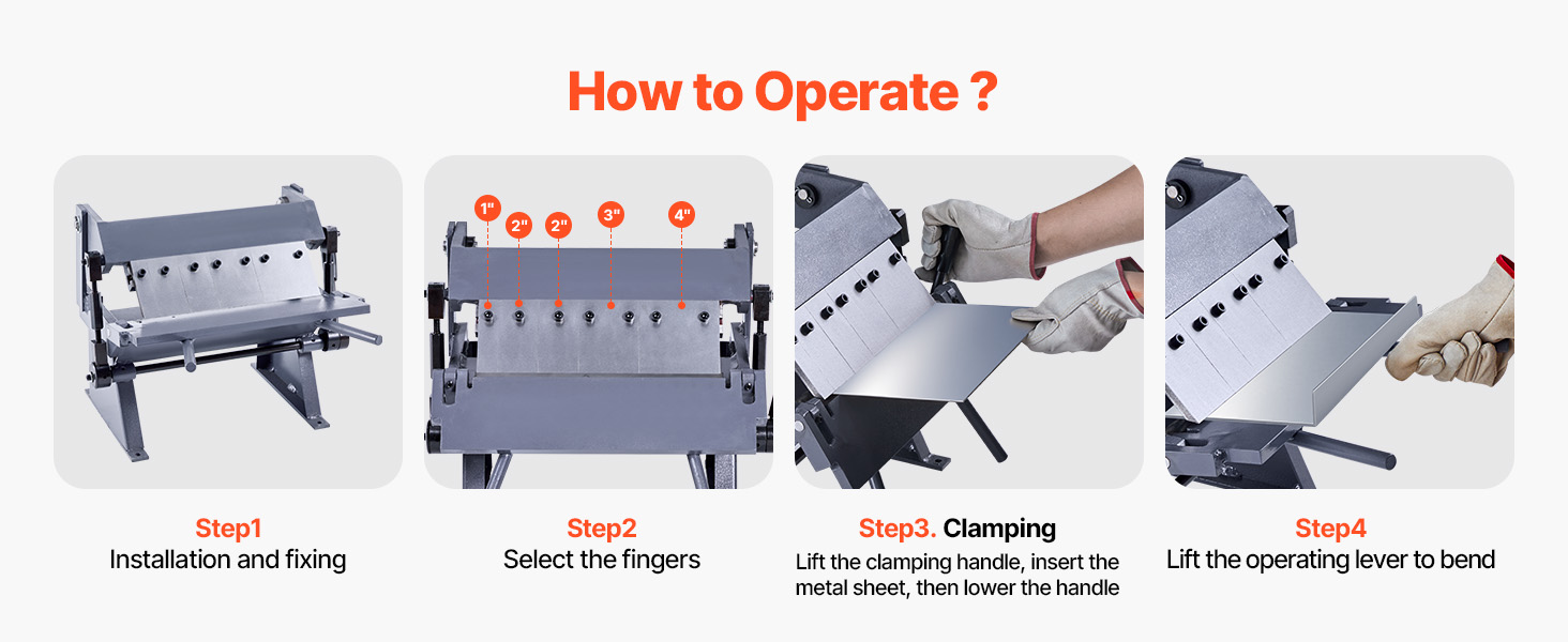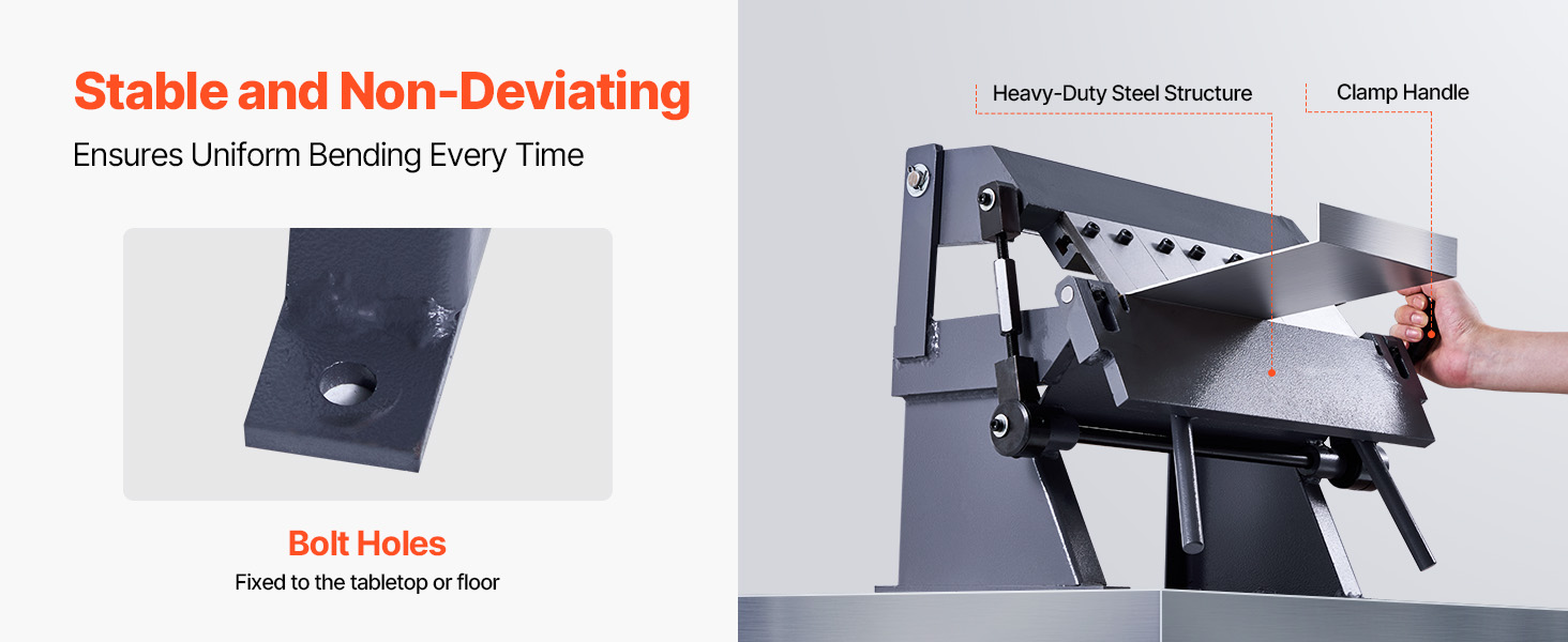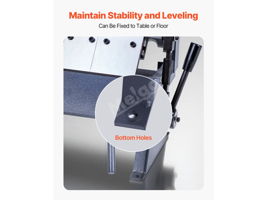 Pripevnite ohýbačku oceľových plechov k pracovnému stolu pomocou skrutiek, aby ste zabránili posunu a zaistili stabilné a presné ohyby.