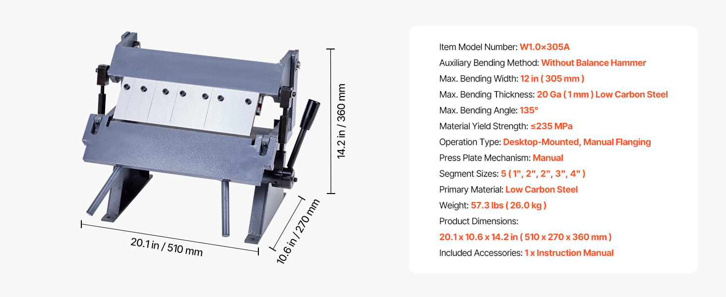 Ohýbačka plechu 305 mm/12 inch, 20 gauge, 0–135° nastaviteľná, 5 prstov