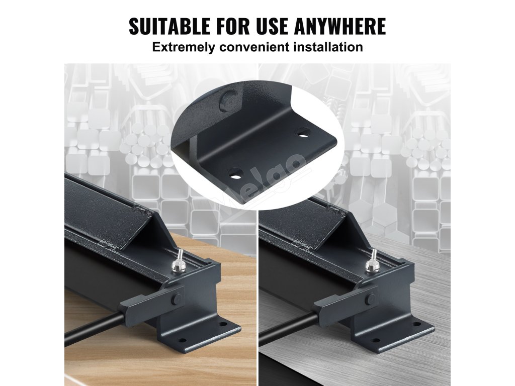 Táto ohýbačka plechu s brzdou je navrhnutá s telom z plnej uhlíkovej ocele a ponúka vynikajúcu stabilitu. Oba konce základne majú predvŕtané otvory, čo vyhovuje stolovému použitiu.