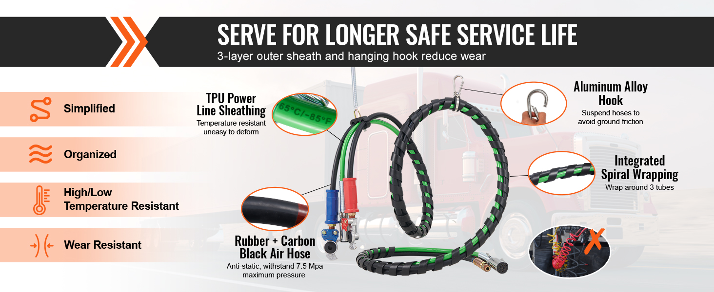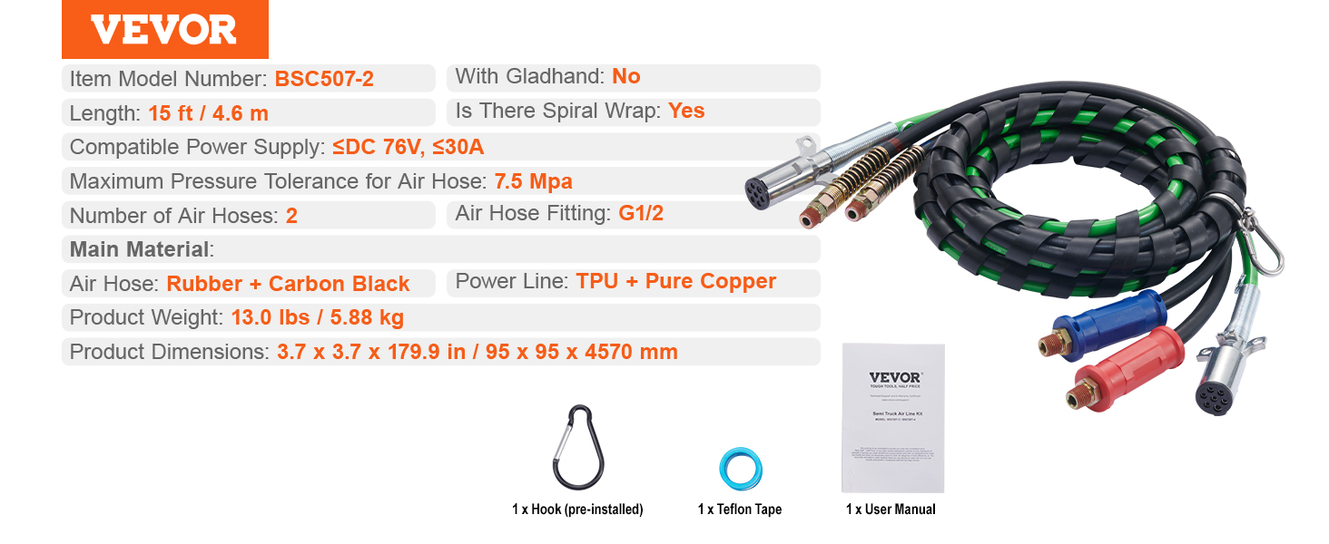 Táto 15FT súprava vzduchových hadíc obsahuje 2 gumené a čierne karbónové vzduchové hadice a napájacie vedenie s TPU plášťom, odolným voči teplu, praskaniu a opotrebovaniu. Háčik z hliníkovej zliatiny dokáže zabezpečiť hadice vo vyššej polohe, čím sa znižuje trenie grounu.