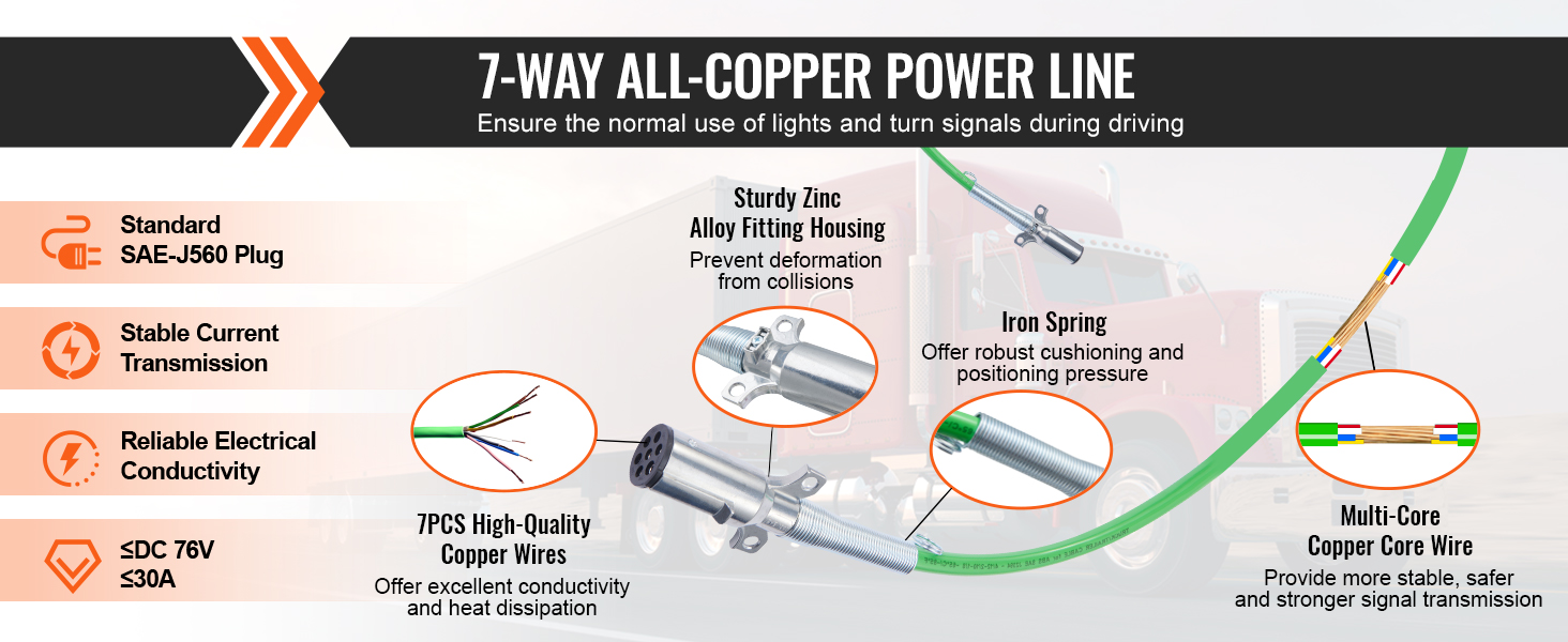 7-cestné napájacie vedenie z čistej medi zabezpečuje normálnu prevádzku svetiel, napríklad smeroviek, počas jazdy, pričom ponúka vynikajúcu vodivosť a odvod tepla. Obsahuje štandardnú zástrčku SAE-J560 pre stabilný prenos prúdu a spoľahlivú vodivosť.