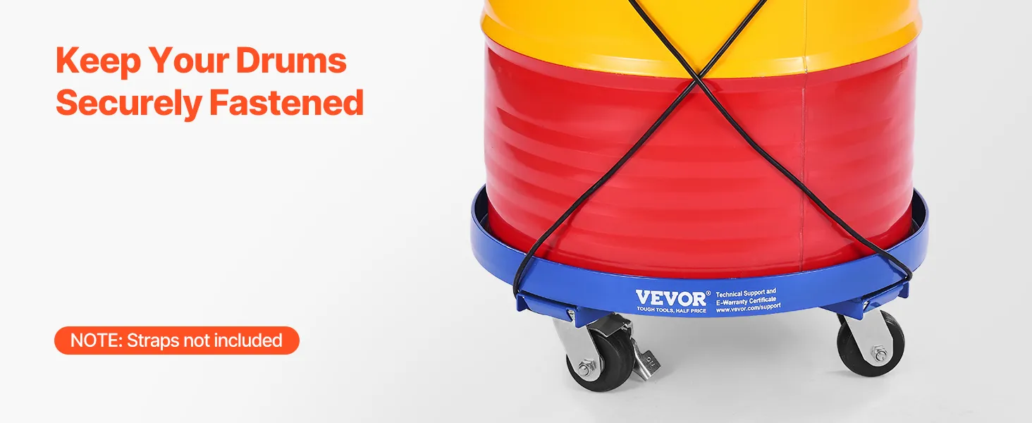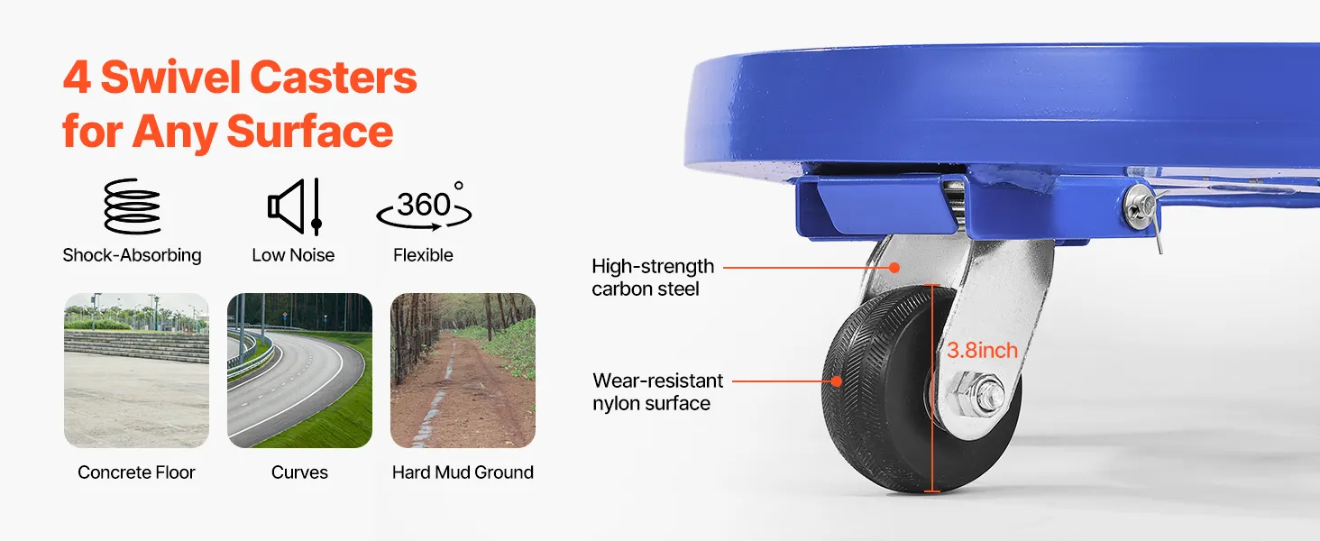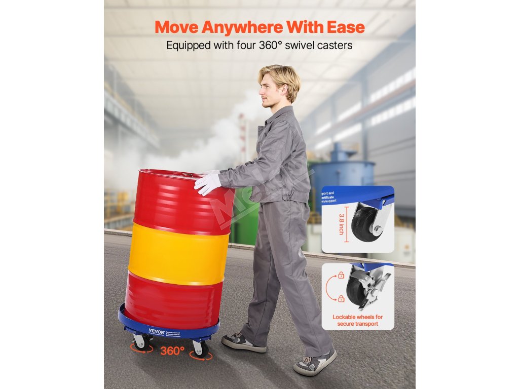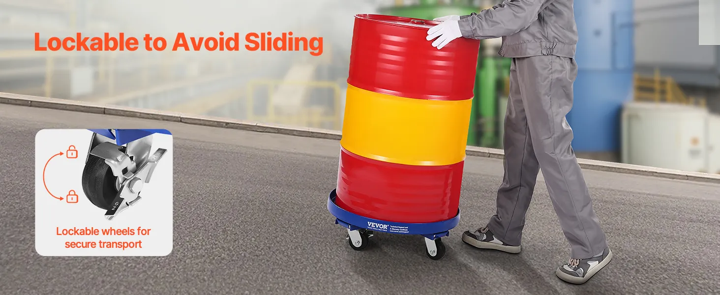 Premiestňujte ťažké sudy s ľahkosťou! Náš vozík na ťažké sudy je vybavený 4 hladkými 3,8-palcovými otočnými kolieskami, ktoré sa kĺžu po akomkoľvek povrchu. Kolieska môžete zablokovať, aby bolo všetko v bezpečí aj počas státia.
