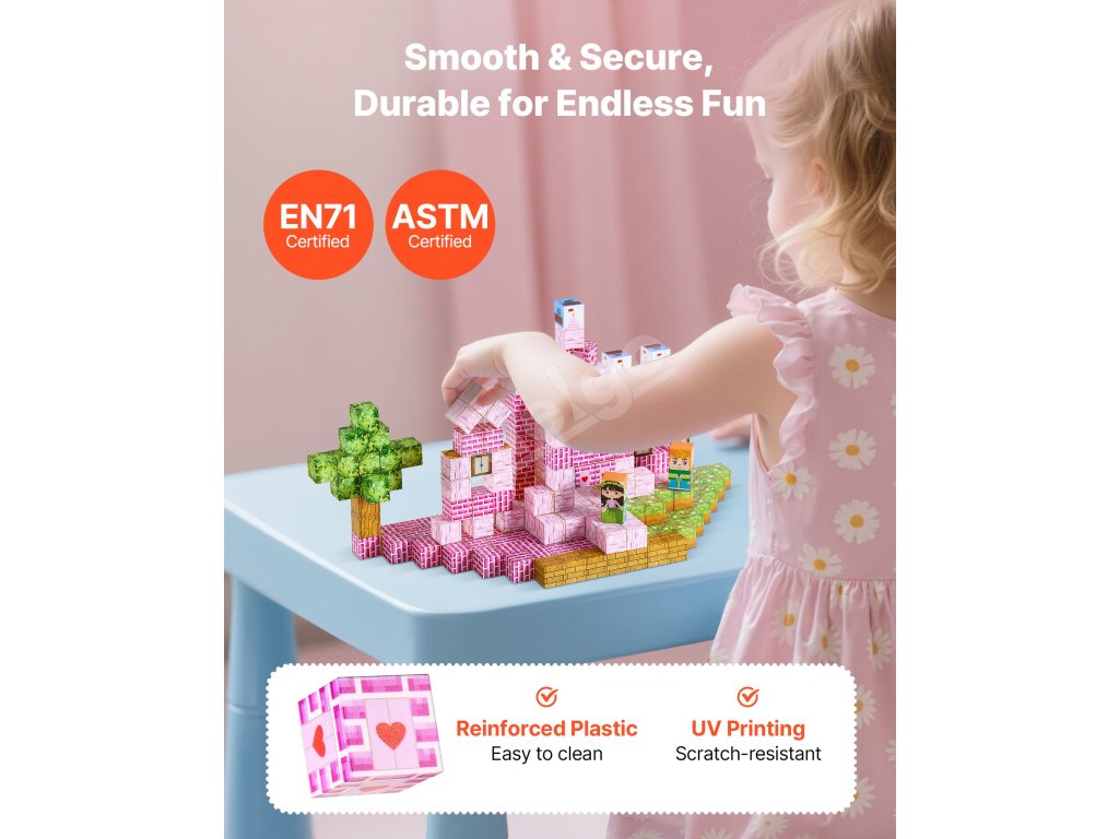 Tieto magnetické stavebné kocky, ktoré sú v súlade s bezpečnostnými normami pre hračky, sú vyrobené zo spoľahlivých materiálov s veľkosťou vhodnou pre deti, čo zaručuje bezpečnú hru a zároveň zabraňuje prehltnutiu.